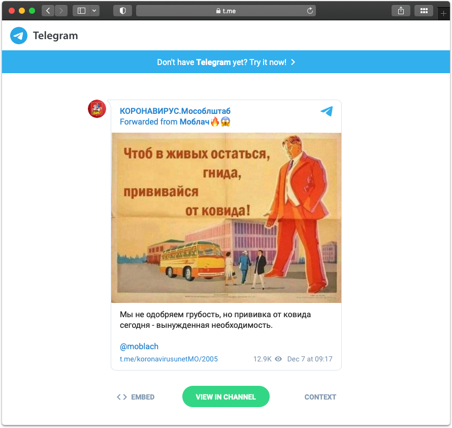 Утром 7 декабря оперативный штаб по борьбе с коронавирусом в Московской области разместил в своем телеграм-канале агитационный плакат с изображением поэта Владимира Маяковского и словами «Чтоб в живых остаться, гнида, прививайся от ковида!». Первоначально его опубликовал канал «Моблач», а Мособлштаб репостнул запись.