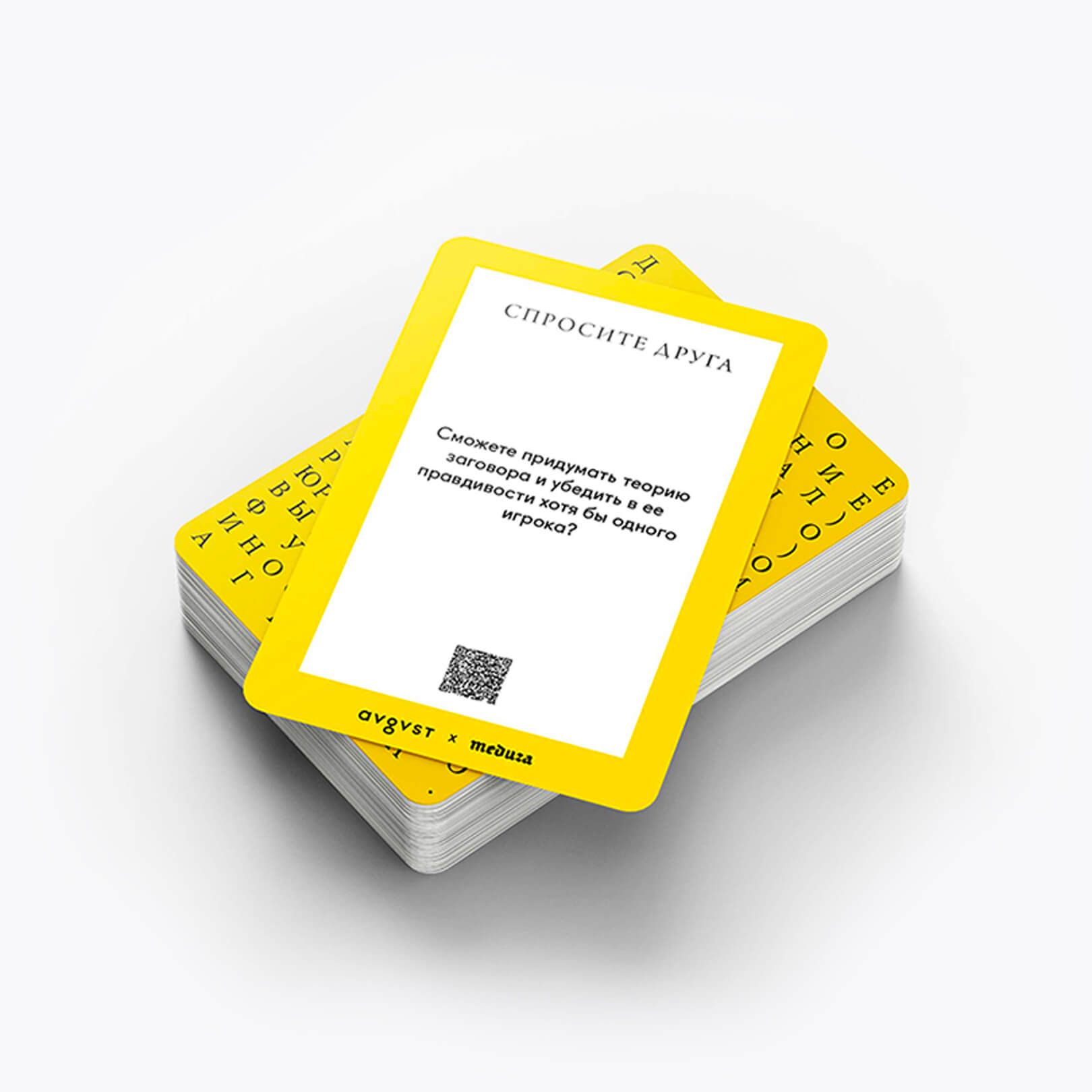 На некоторых карточках есть QR-коды. Это материалы «Медузы», которые помогут вам глубже погрузиться в тему (если вы захотите). На каждой карточке действие: отвечайте сами, передайте другу, обсудите тему вместе или объясните без слов. Не забывайте, что на эти вопросы невозможно ответить правильно или неправильно. Зато, отвечая на них, можно лучше понять мир, себя и других.