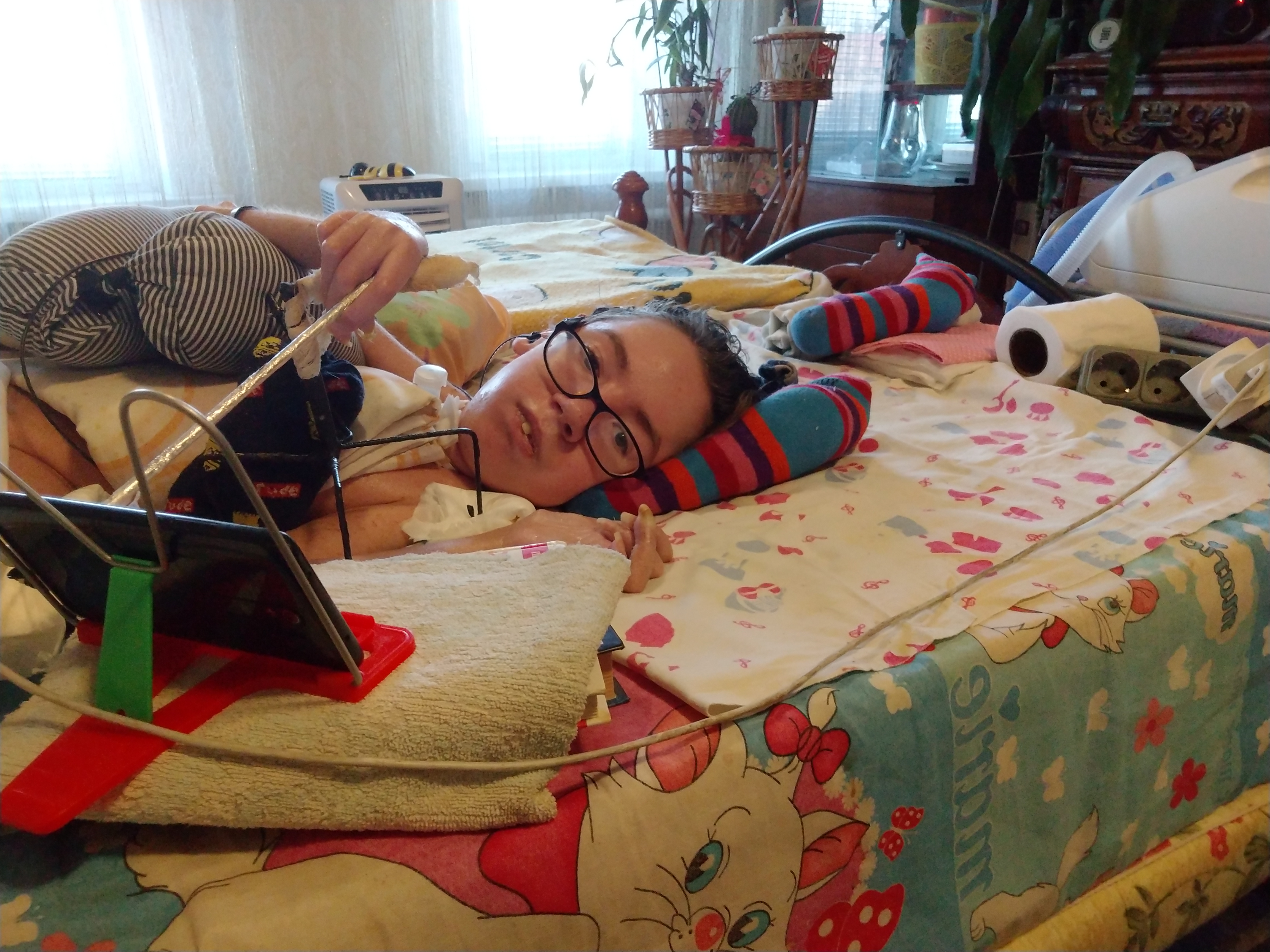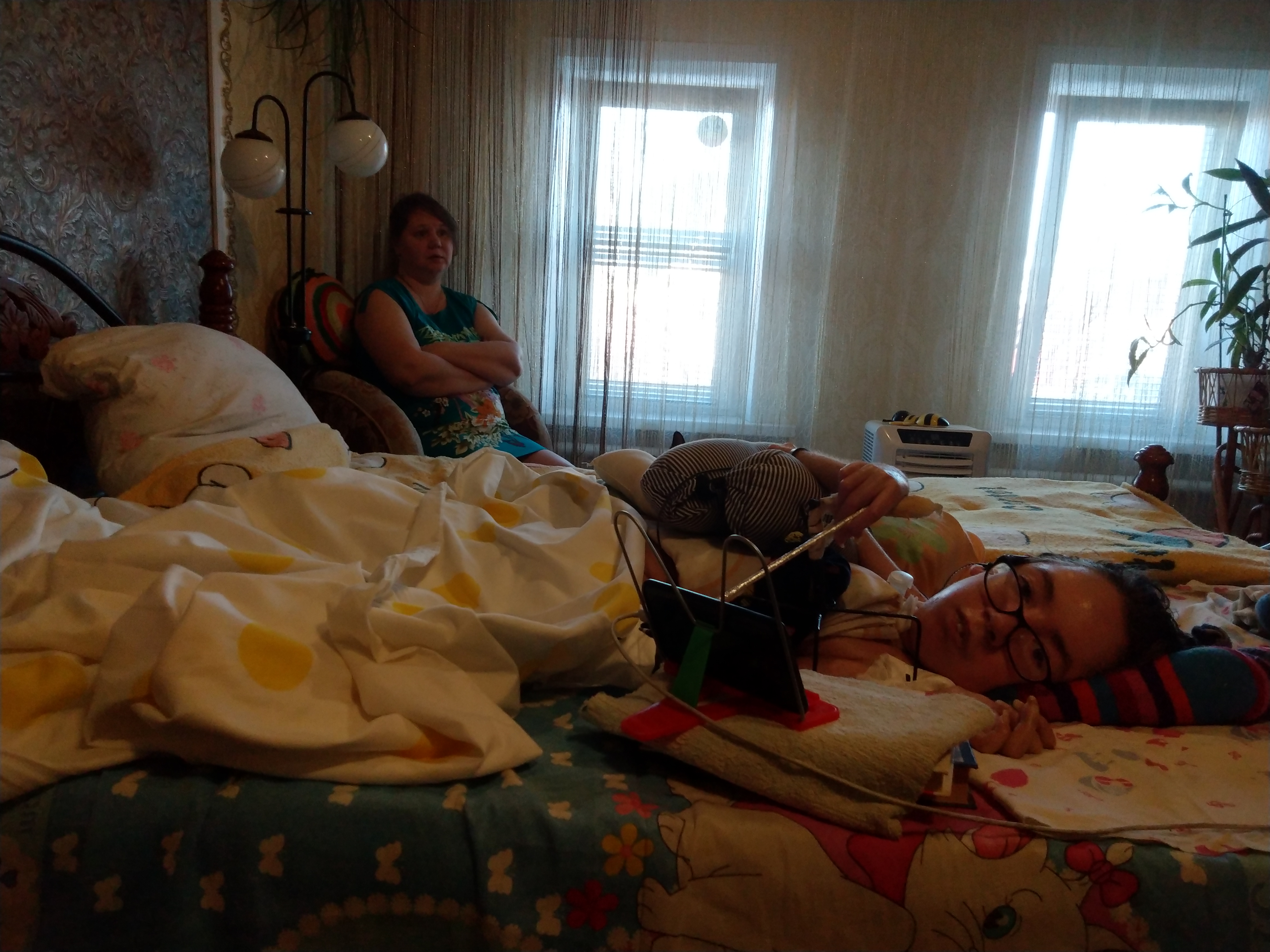 Даня лежит на кровати, прикрытый простынёй. Под спиной – самодельный валик, под правой рукой черная подставка-паучок, которую ему сварил старший брат. Верхняя перекладина подставки обмотана бинтом, чтобы не врезалась в нежную кожу. В двух еще работающих пальцах зажат самодельный стилус – Даня с его помощью путешествует по соцсетям в смартфоне. Все его друзья – исключительно виртуальные, но зато живут по всему миру. В школе юноша учил английский, чем теперь и пользуется.