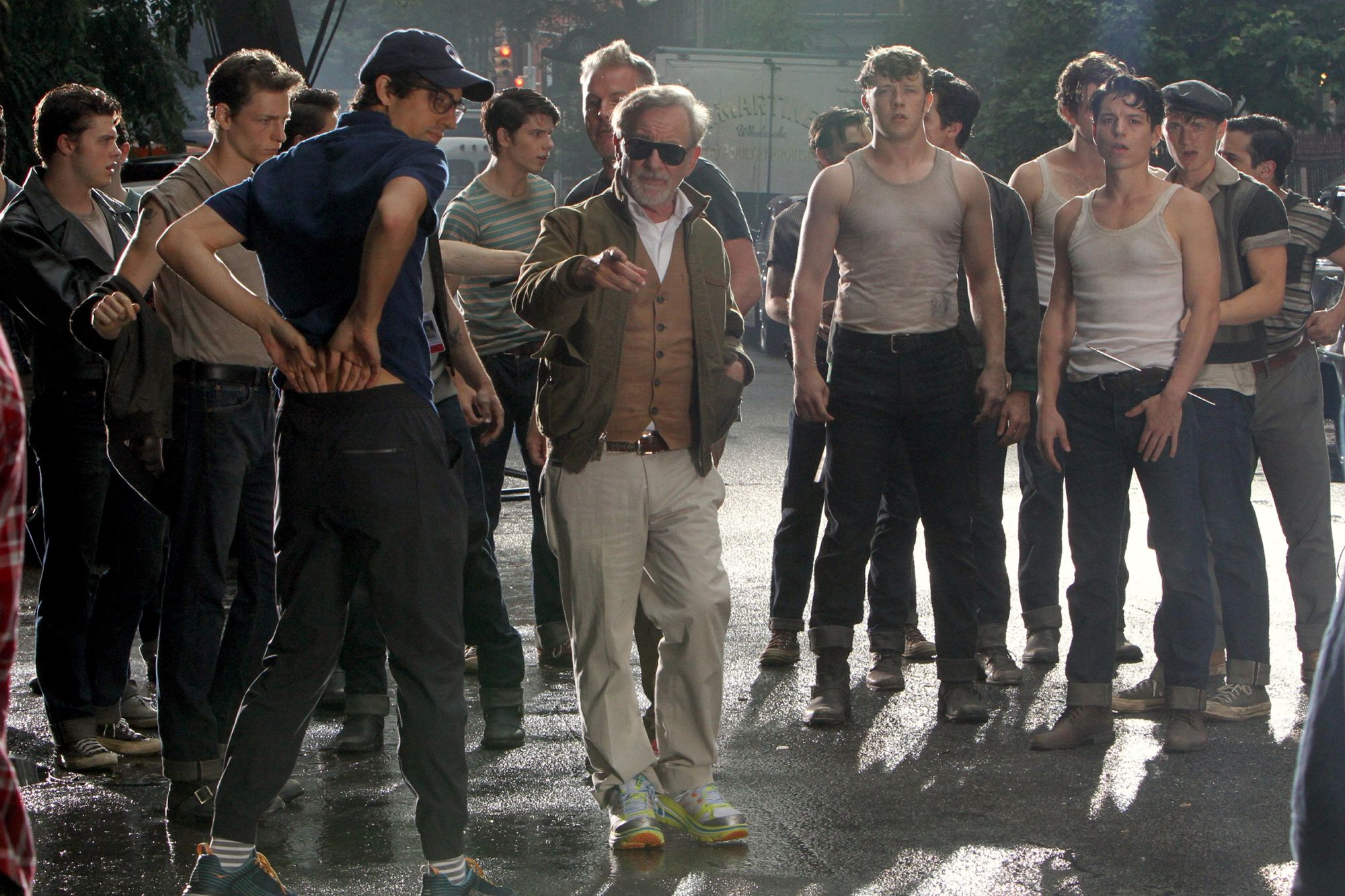 Спрятанный в старой картине контекст Спилберг делает явным, обнажая заодно мотивы участников подростковых банд: они обороняют свою территорию и от бессилия бросаются друг на друга. Уточнены и другие детали. Если белые «Ракеты» принципиально не хотят работать («Я не антисоциален, я просто против работы», — поет один из них в язвительном диалоге с воображаемым копом; здесь сцена перенесена в полицейский участок), то «Акулы» как иммигранты обречены на круглосуточный труд. Их драчливость — чистый защитный рефлекс, ведь против них не только соперники по уличным войнам, но и власти, да и просто большинство «местных». Что им остается?