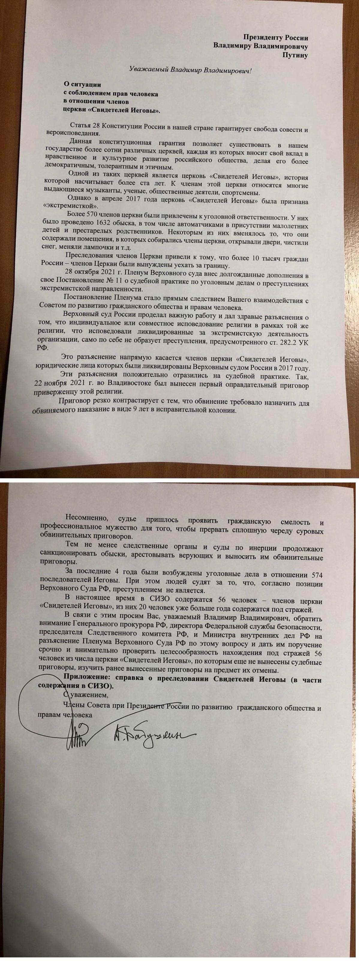 В письме, оригинал которого можно прочитать на этой странице, в частности отмечается, что уголовные дела, возбужденные за последние 4 года против 574 последователей этого религиозного течения, возбуждены, по сути, незаконно и неправомерно. На данный факт указывает не только 28 статья Конституции РФ, гарантирующая всем гражданам свободу совести и вероисповедания, но и постановление Пленума Верховного суда РФ от 28 октября 2021 года. Данное постановление примечательно тем, что в нем прямо поясняется правоприменение «экстремистской» статьи 282.2 УК РФ, по которой в России судят Свидетелей Иеговы*.