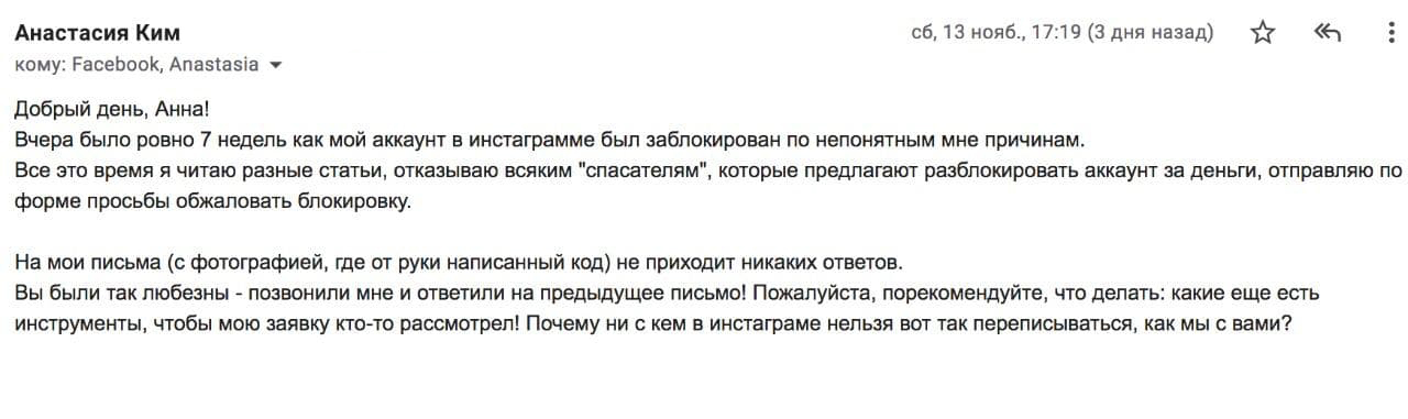 Прошла еще неделя, ничего не менялось. Я написала той девушке душераздирающее письмо на почту, с которой она мне прислала ссылку, где подать жалобу (это была та же ссылка, по которой я уже писала). Написала, что она единственный человек, который [в этой ситуации] для меня как-то материализовался, попросила не бросать меня. Все эти письма от инстаграма вызывают ощущение, что ты одинок, общаешься с какой-то бездушной машиной.