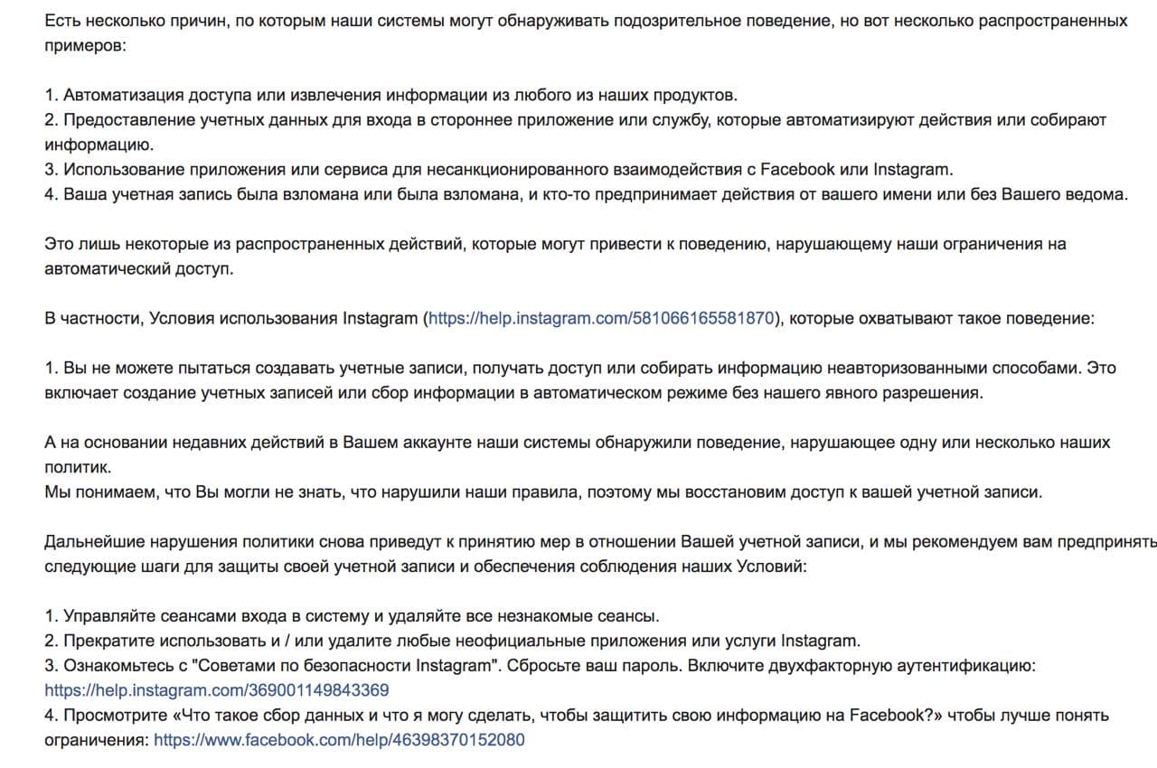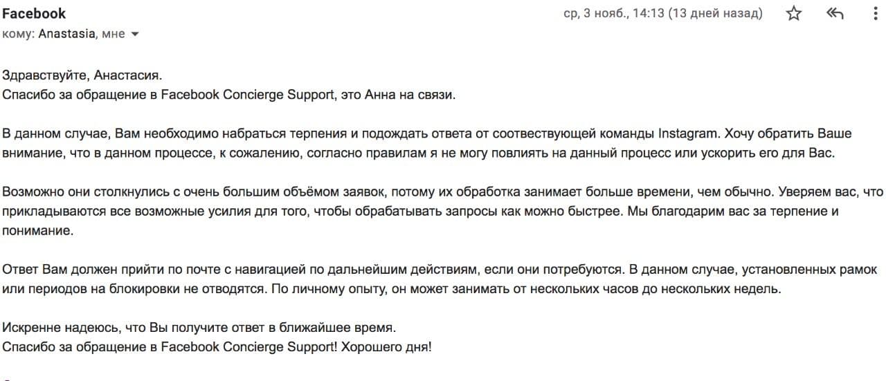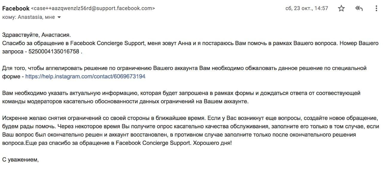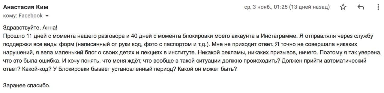 Через сутки мне опять поступил звонок — уже от другой девушки. Я сказала, что у меня идет уже седьмая неделя блокировки. Она ответила, что это действительно очень длительный период и что она попробует помочь — отправит заявку от себя. Сказала: ждите 48 часов, вам должно прийти письмо от фейсбука. Где-то часов через 50 пришло очень большое письмо от фейсбука, в котором говорилось, что «вы нарушили правила» и «могли не знать, что нарушаете». За что именно был блок — не пояснялось. И в конце говорилось — ваш аккаунт активирован.