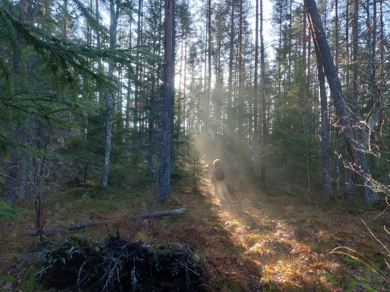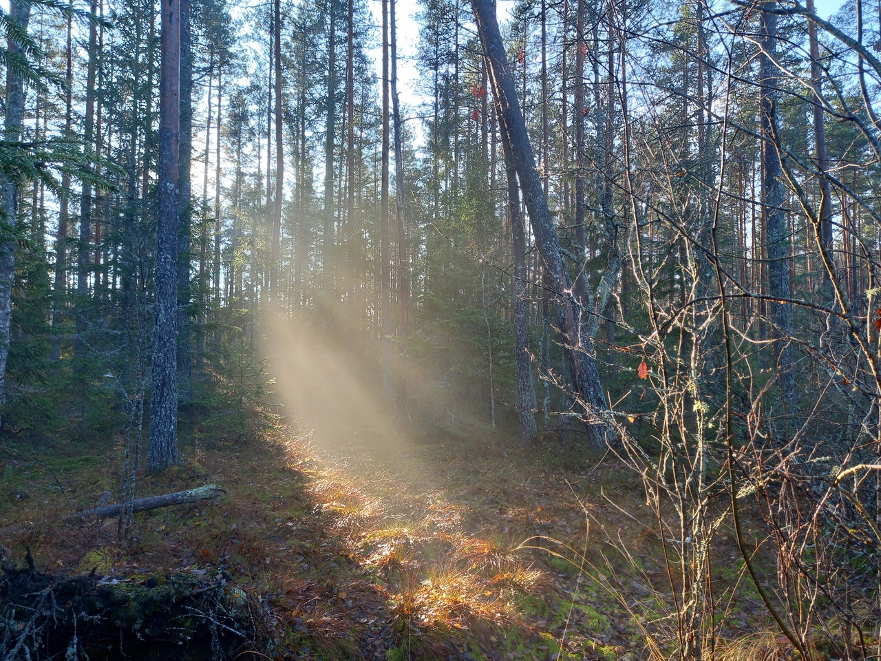 Идем через лес. Дальше дорога проходит через место, погруженное в тень. И там еще остался утренний туман, который в других местах уже растворился под действием солнечного света. Здесь же он еще удерживается, и солнечные лучи его красиво подсвечивают.