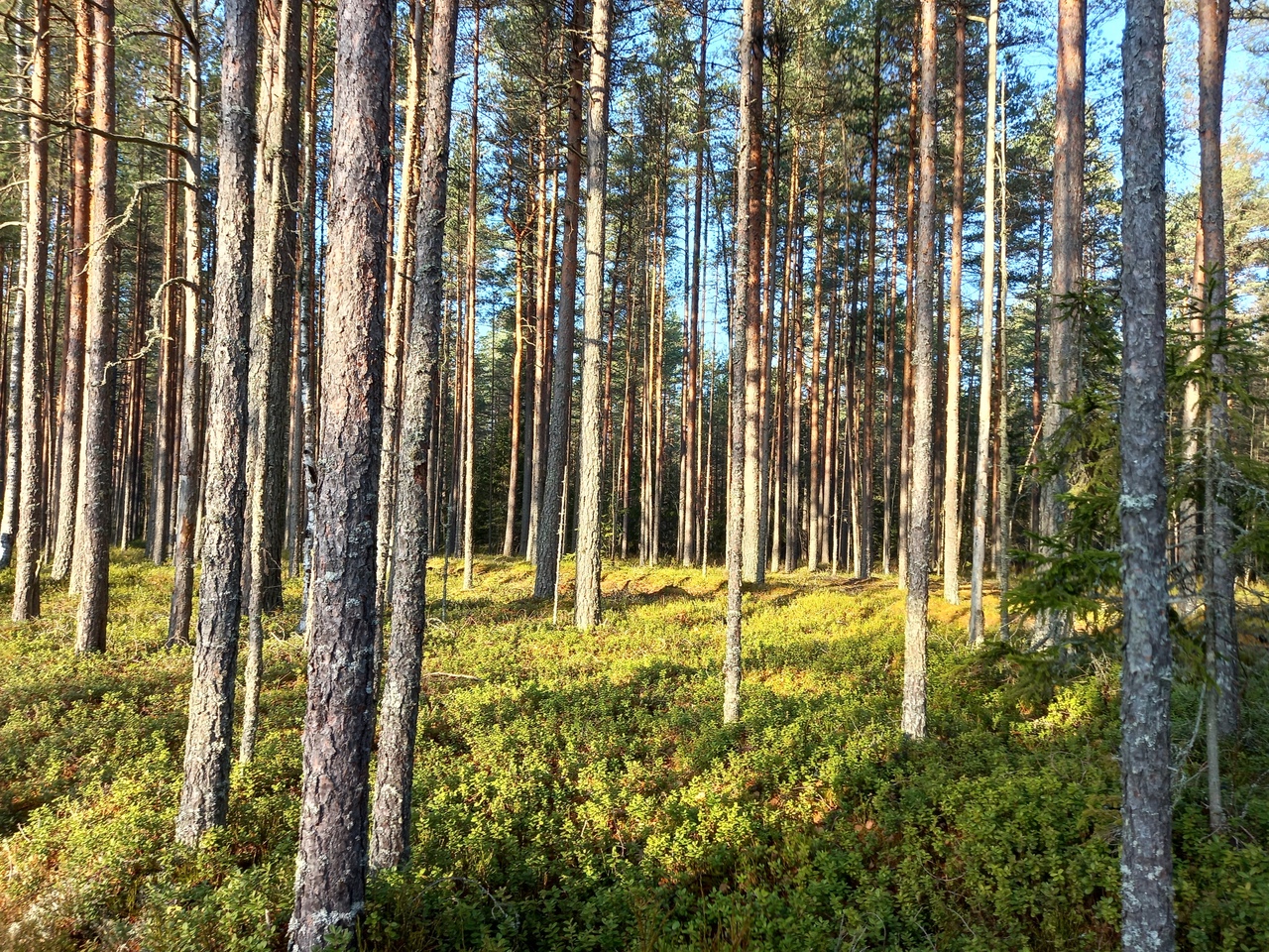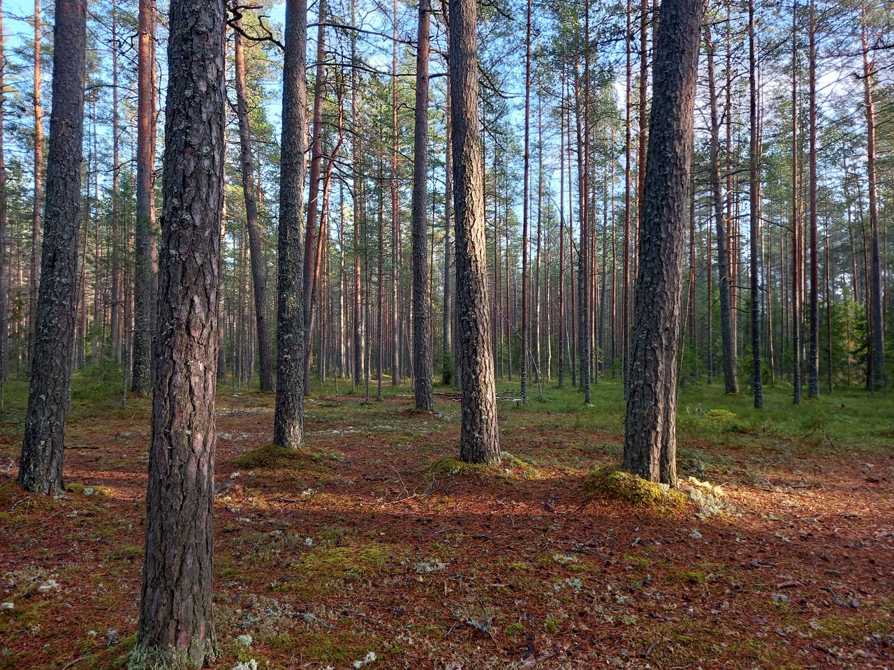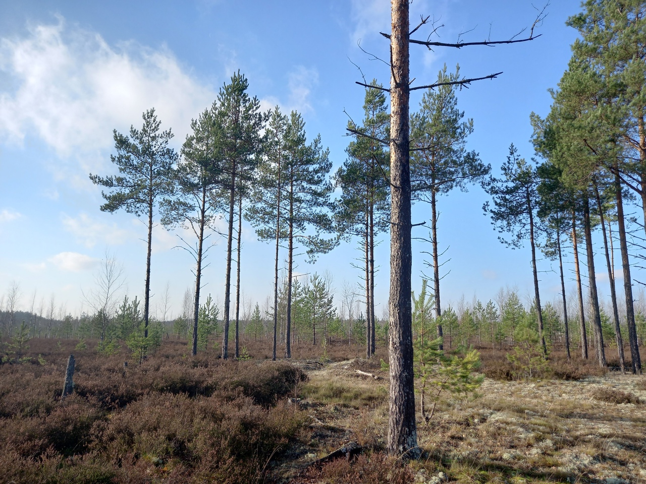 Отдельные сосенки на покрытых мхом полянках. Сосенки и вереск. Пейзажи как в Карелии.