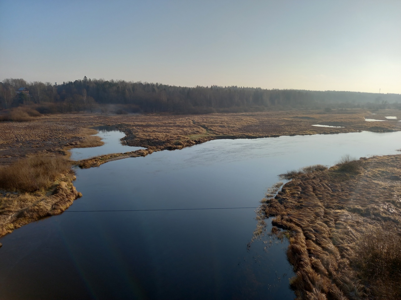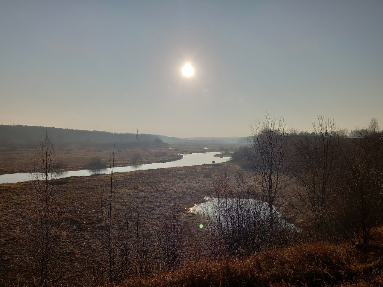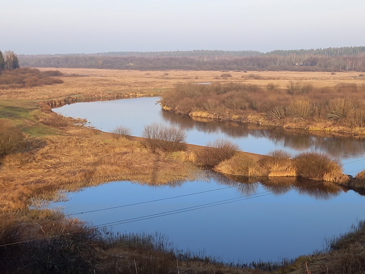 Пока идем по нему, любуемся очень красивыми пейзажами речной долины. Весной она полностью залита водой, от края до края. Осенью бывает по-разному. Сейчас воды не очень много, поэтому река узкая, а рядом с ней отделившиеся от нее старицы. Дальше четыре фотографии.