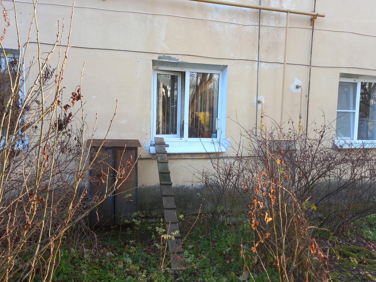 Один из домов поселка привлек внимание. К окну приставлена лесенка для кота, чтобы тот мог выйти погулять. Сам кот тоже виден, если внимательно присмотреться, — он у щелки между створками окна.