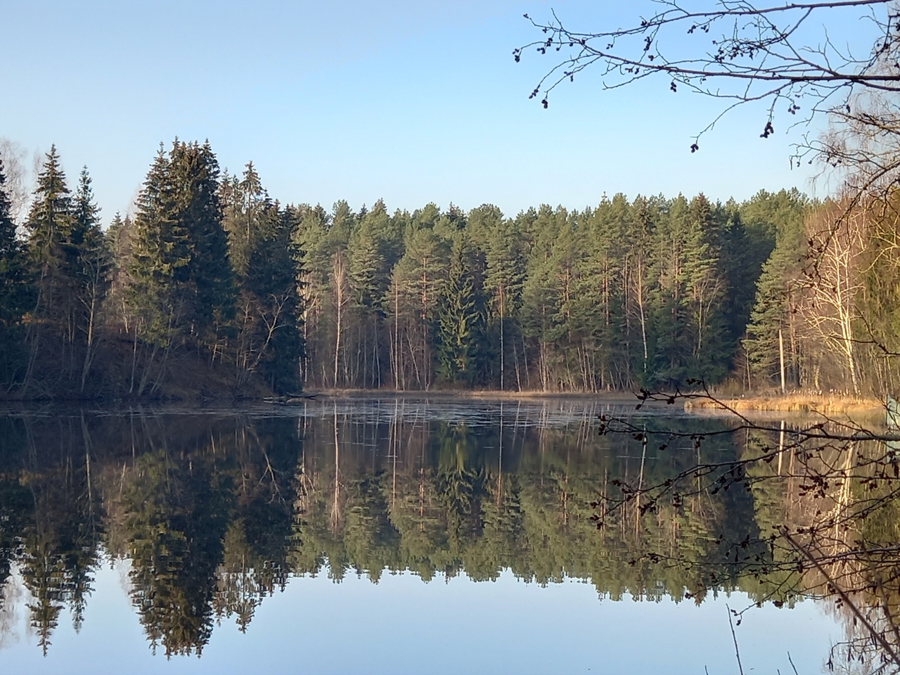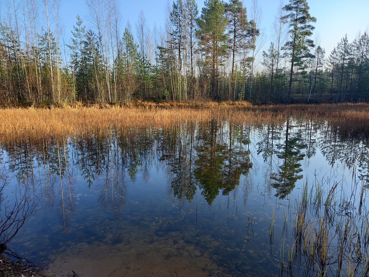 Прошли станцию Толмачево, пошли по шоссе в сторону поселка Живой Ручей. У поселка повернули направо, затем ушли в лес по грунтовой дорожке. Через некоторое время она вывела нас к туристической стоянке возле прудов в лесу, которые образовались на месте старых песчаных карьеров. Пруды мелкие, сильно заросли камышом. Но вода в них прозрачная.