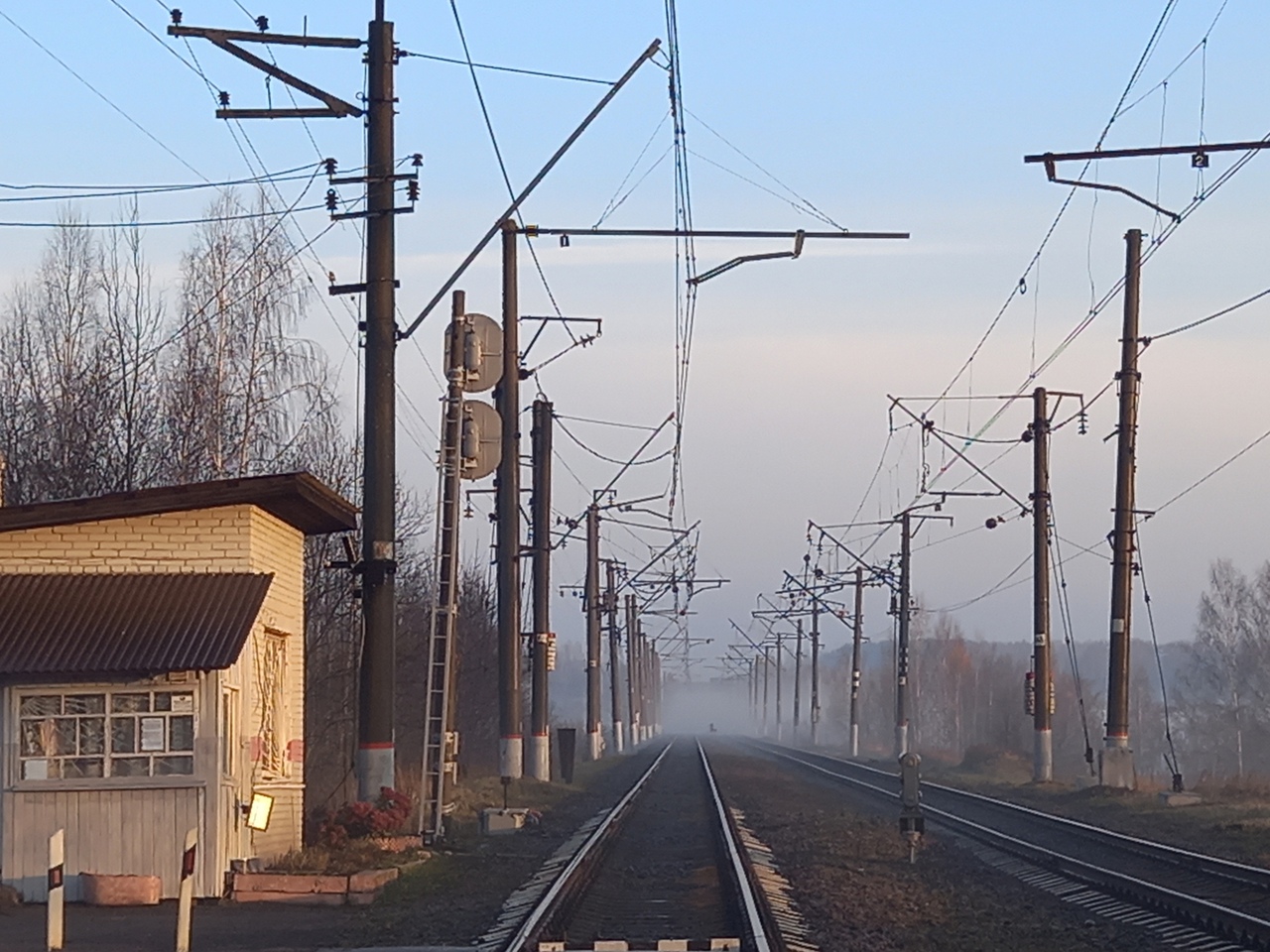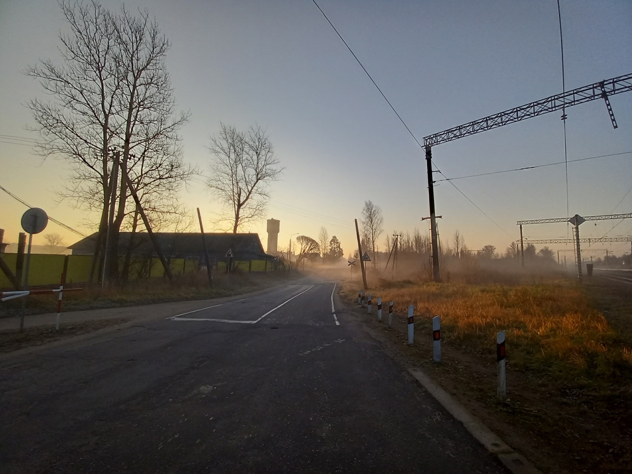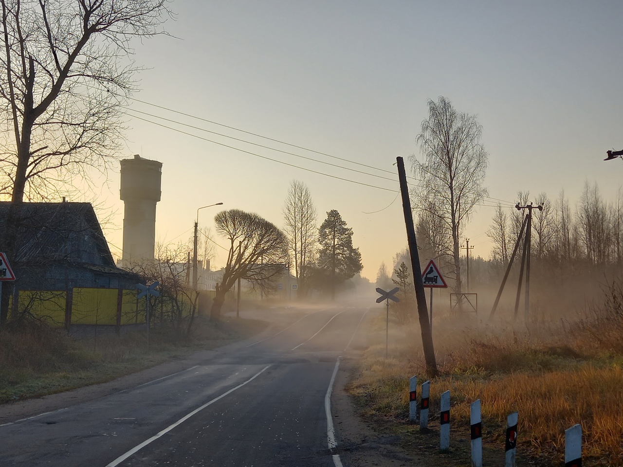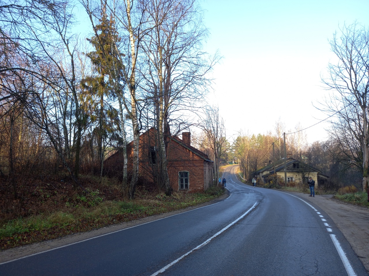 31 октября. Выехали самой ранней электричкой с Балтийского вокзала. Выходим за две остановки до Луги, на платформе Партизанской. Солнце только встает, и на платформе еще виден иней, образовавшийся морозной ночью.