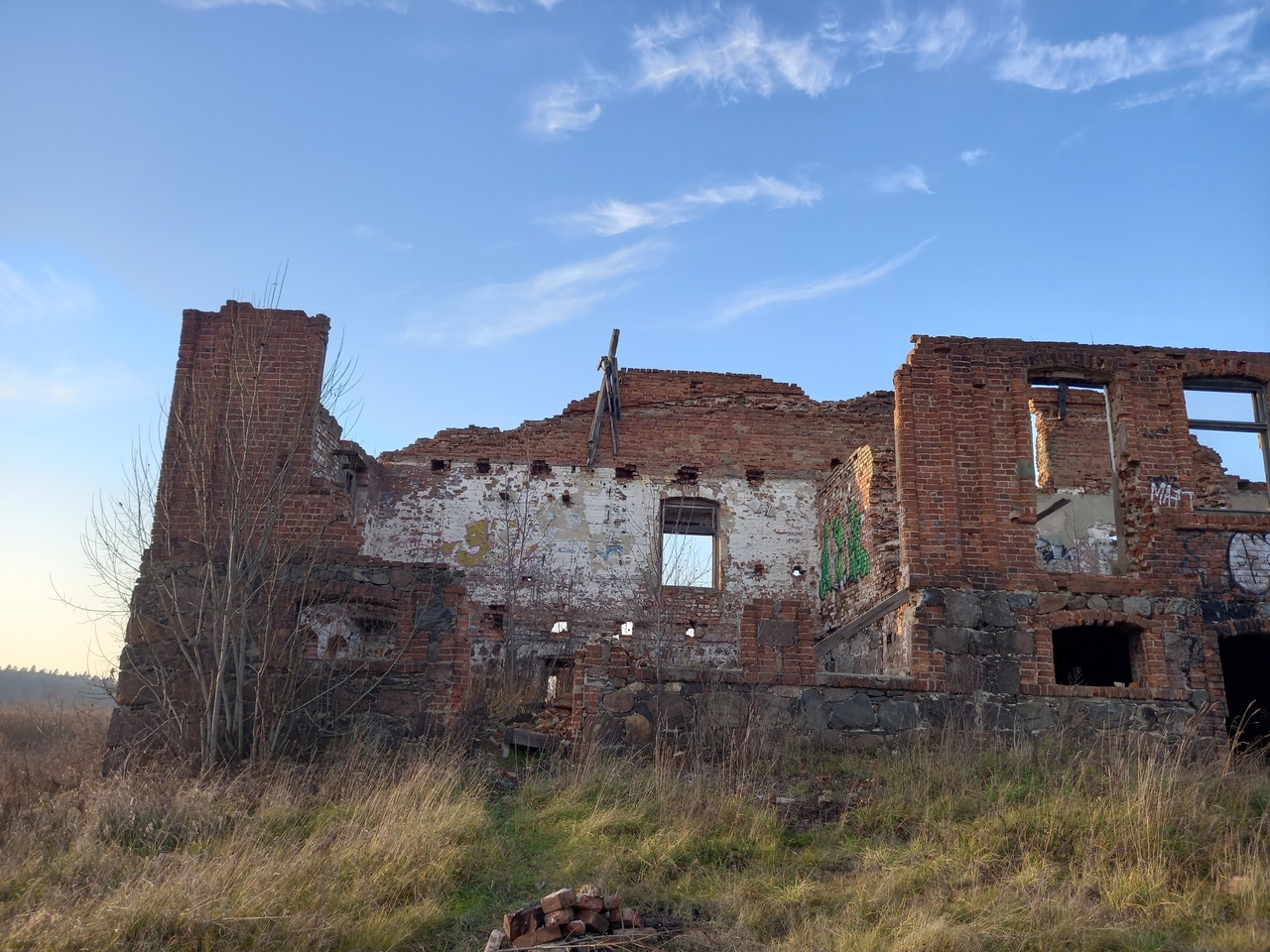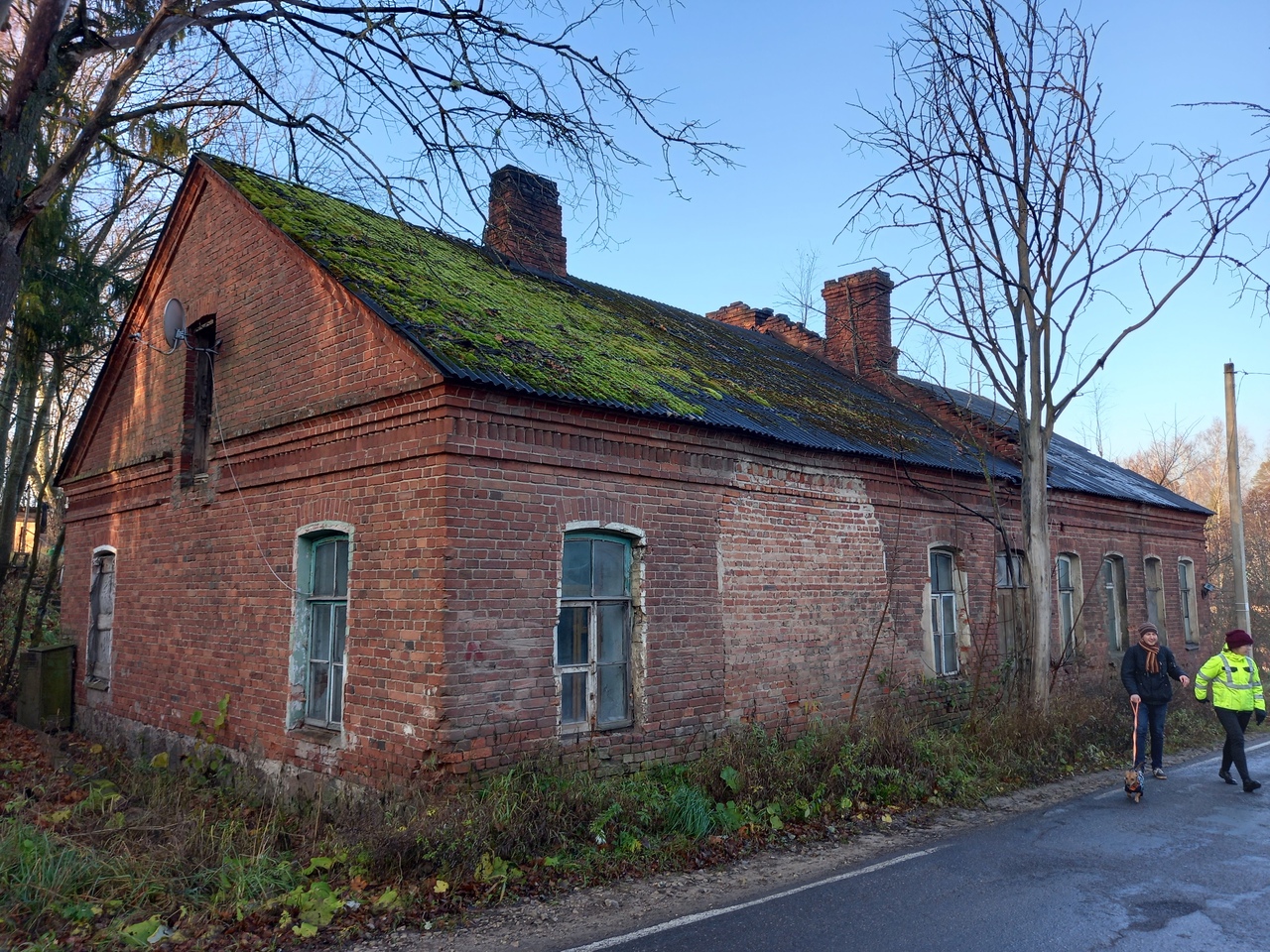 Вид издалека. Слева кирпичный дом, справа желтенький, который тоже старый, и к нему примыкают развалины мельничной постройки.