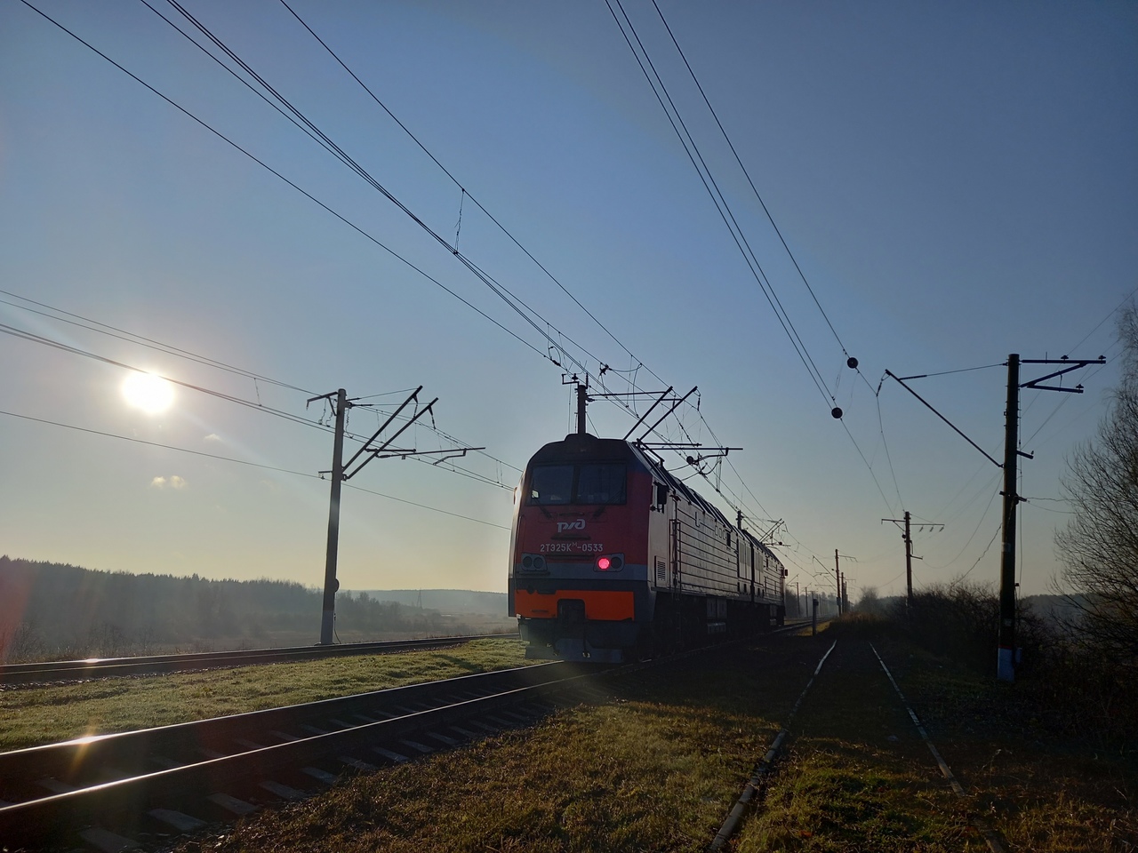 Мимо нас проехал из Толмачева в сторону Луги тепловоз «2ТЭ25Км» - первый российский тепловоз, собранный из отечественных деталей. Именно этот локомотив выпущен в Брянске в феврале 2021 года, так что он совсем новенький!