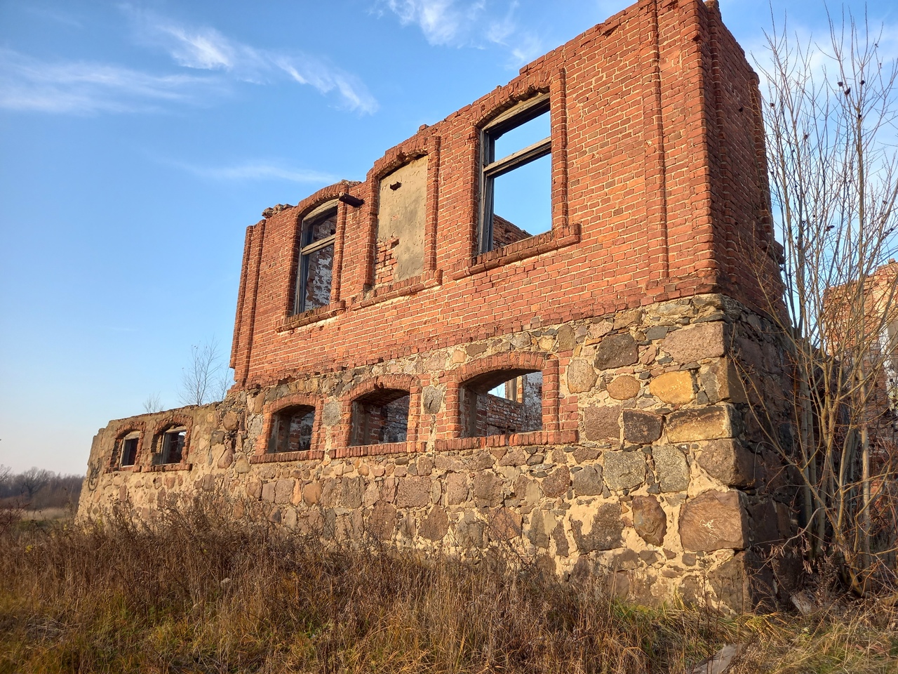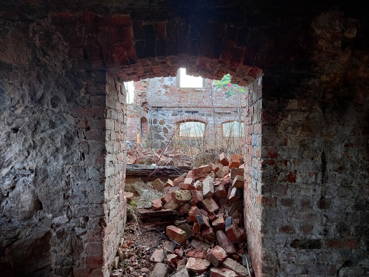 Здание разрушается, причем стремительно. И не само по себе - люди активно этому помогают. Сначала выдрали все металлическое, начав процесс разрушения стен, потом стали выламывать и сам кирпич. При нас какой-то человек южного вида увез отсюда тележку с кирпичами.