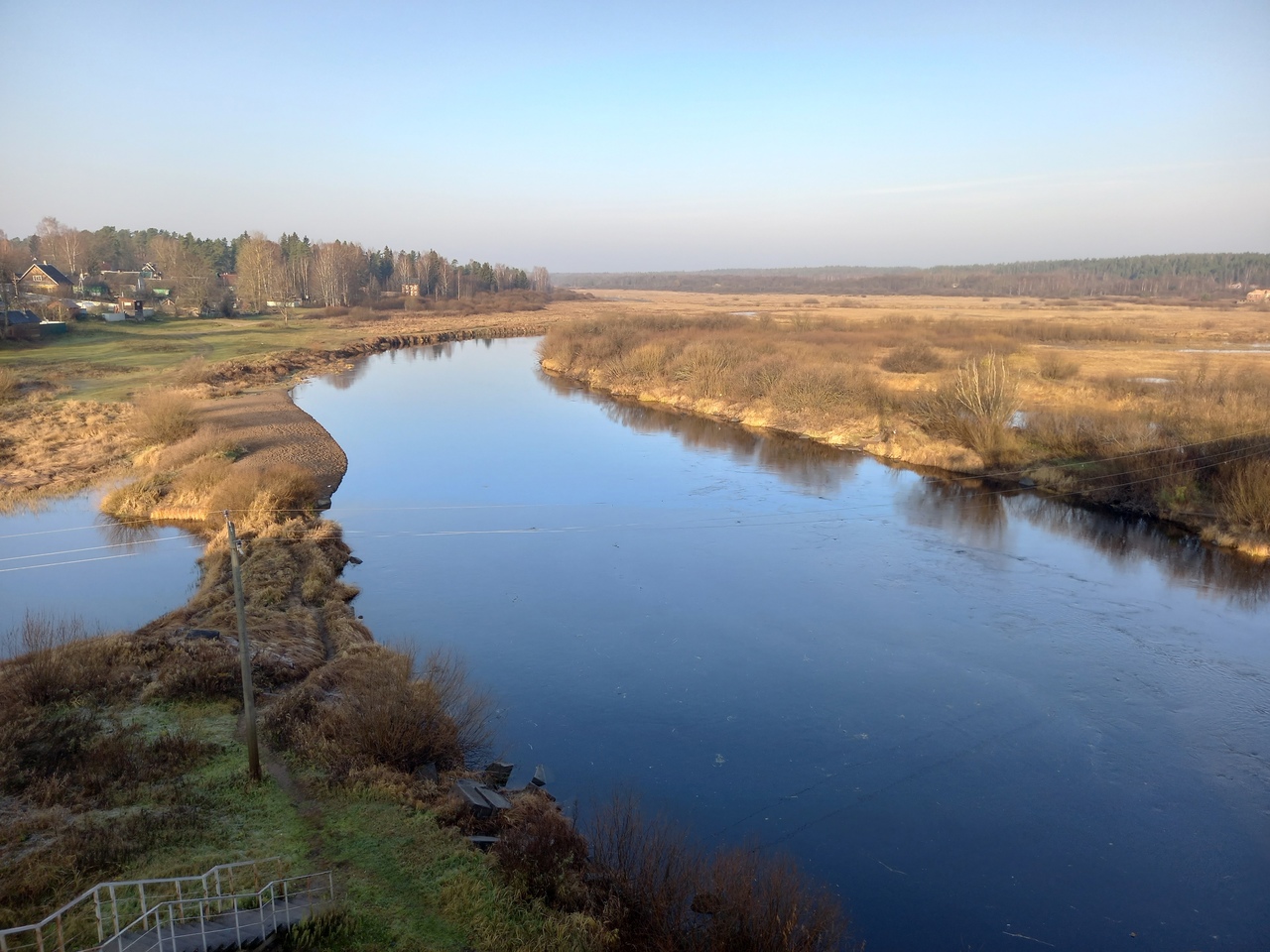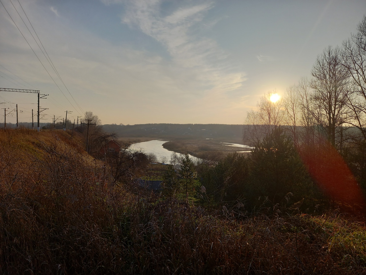 Вид из окна на реку Лугу. Солнце уже клонится к горизонту.