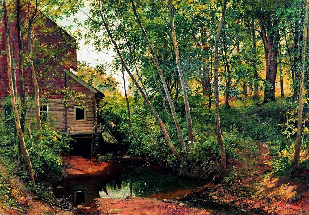 А вот и картина Шишкина - "Мельница в лесу на станции Преображенская". Преображенской называлась станция Толмачево на другом берегу реки, куда мы пойдем позже, а платформы Партизанской тогда еще не существовало.