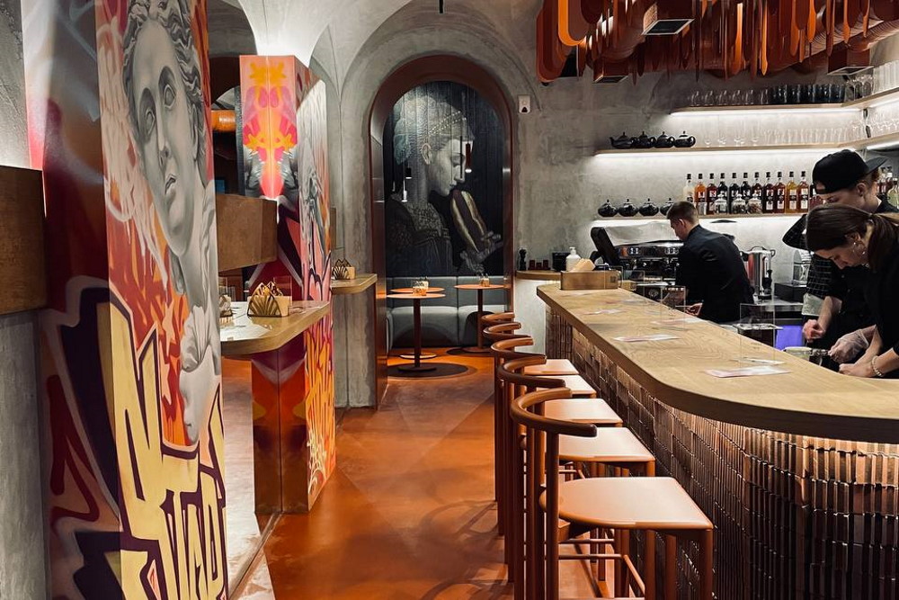 Заведение занимает два зала, в одном из которых расположена открытая кухня. Оформлением занимались петербургские дизайнеры из студии A.dept, а стены разрисовали граффити-художники.