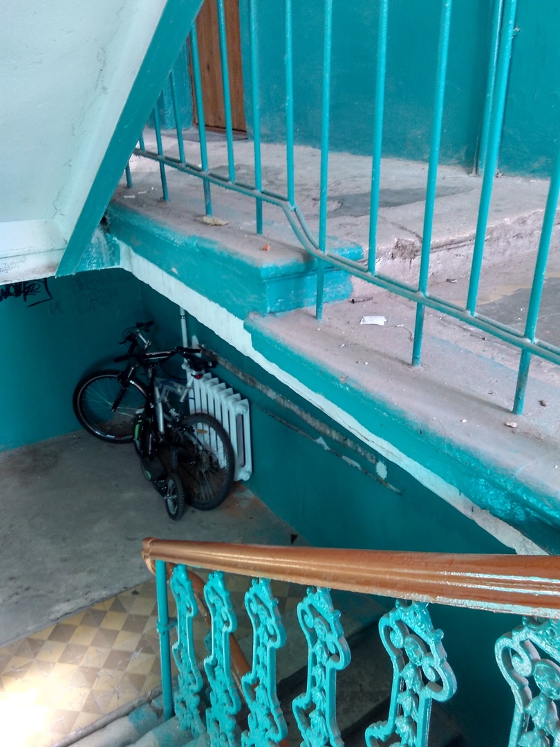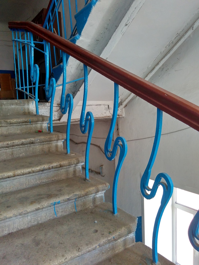 По дому видно, что он не только знавал лучшие времена, но и был заметно «оптимизирован» в 1960-х, лишившись почти всей лепнины на фасаде, а взамен приобретя дополнительный 3-й этаж. Поэтому самое интересное в нем находится не снаружи, а внутри. Это фрагмент старинной каменной лестницы с ажурными чугунными перилами.