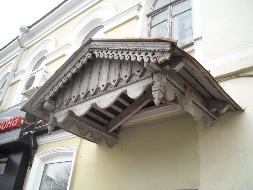 Это двухэтажное здание с окнами второго этажа в форме арок и редким для каменных зданий деревянным козырьком над входом в один из подъездов.