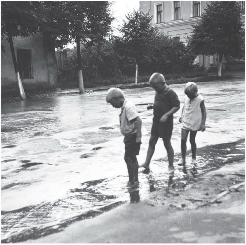 На одном из них трое ребятишек после летнего дождя босыми ножками замеряют глубину ручья, образовавшегося на улице прямо напротив райкома-школы. За ними — дом и сад на месте сквера Калинникова.