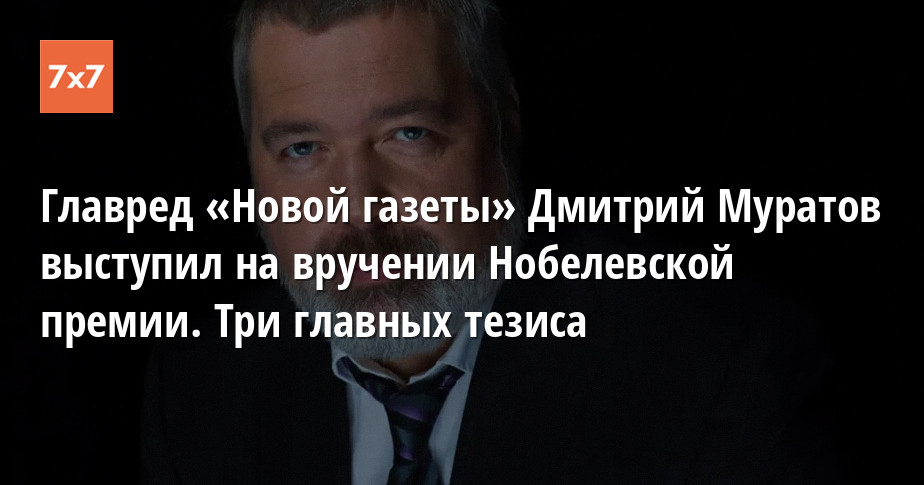 Главный редактор «Новой газеты» Дмитрий Муратов выступил на вручении Нобелевской премии. Он получил награду за «усилия по сохранению свободы мысли как непременного условия для демократии и мира». Во время выступления Муратов рассказал о законе об иностранных агентах, преследовании политика Алексея Навального, деле Анны Политковской, ликвидации правозащитной организации «Мемориал»* и пытках в российских колониях. Три главных тезиса из выступления главреда «Новой» — в обзоре «7x7».