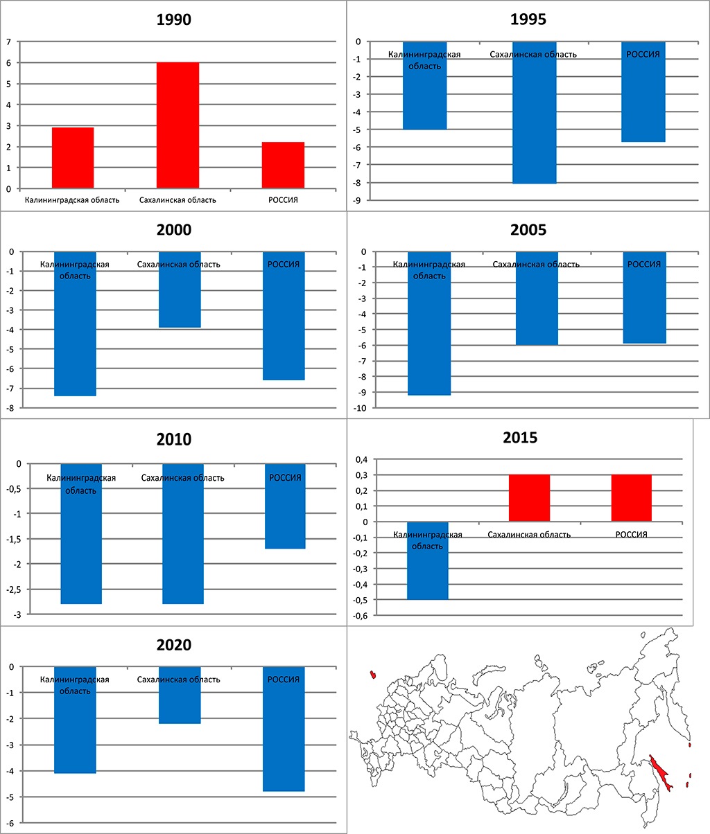 При этом, если мы посмотрим на статистику естественного движения населения, то показатели и рождаемости, смертности, и естественного прироста Калининградской и Сахалинской областей в среднем были сопоставимы со среднероссийскими, но колебались от года к году.
