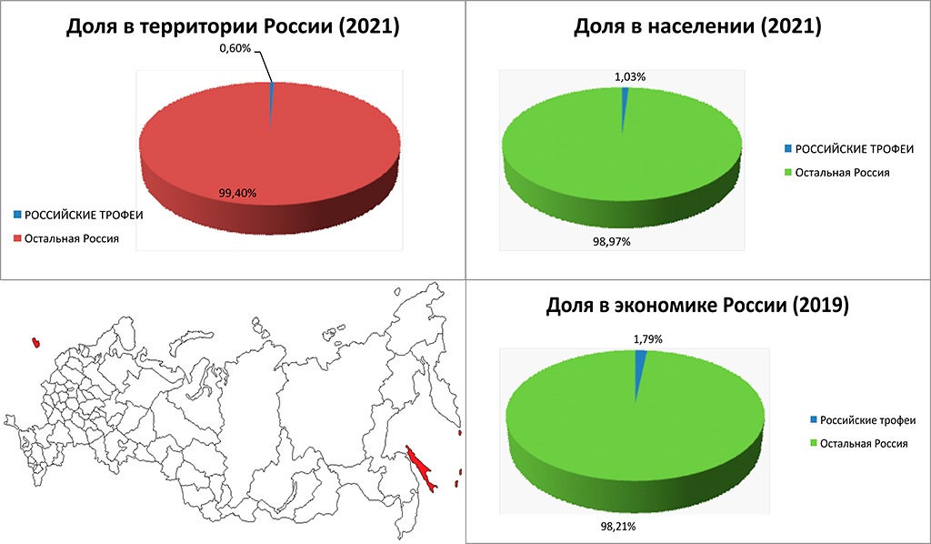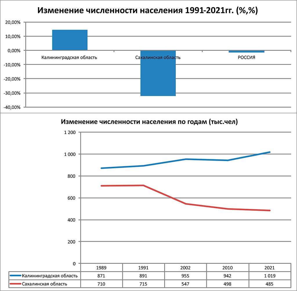 В целом, как мы видим, рассматриваемые нами «островные» в прямом и переносном смысле регионы, занимают около 0,6% территории России, концентрируют чуть более 1% ее населения и без малого 2% экономики. Причем, если численность населения Калининградской области за постсоветское время выросло на 15%, то Сахалин и Курилы потеряли около трети первоначального населения.