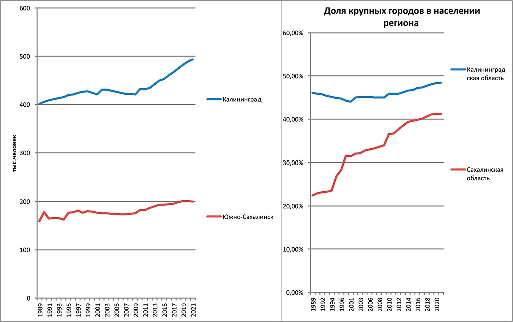 Что касается крупных городов, то ситуация здесь очень простая — больше 100 тысяч жителей насчитывало население только областных центров — Калининграда и Южно-Сахалинска. При этом если населении обоих городов выросло за постсоветское время в среднем на 20% (Калининграда с 400 тысяч почти до полумиллиона, а Южно-Сахалинска со 160 до 200 тысяч), то их доля в населении региона стала очень сильно отличаться. Ввиду того что население Калининградской области за пределами областного центра, в целом, росло или сохраняло свою численность, доля Калининграда выросла незначительно — с 46% до 48% от населения региона. Сахалин же за пределами областного центра испытал сильнейшую депопуляцию, и доля Южно-Сахалинска в населении области выросло с 22% до 41%, при этом продолжает расти.