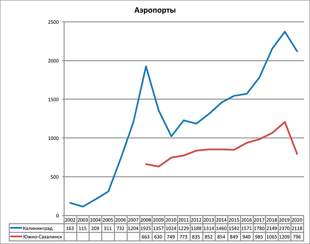 Что касается развития коммуникаций, то мы видим, что единственными крупными аэропортами в регионах являются аэропорты областных центров. При этом рост пассажирооборота аэропортов Калининграда (2,4 млн. пассажиров в 2019) и Южно-Сахалинска (1,2 млн. пассажиров в 2019) соответствует среднему росту аэропортов России, с каждым годом все больше включающейся в процессы глобализации.