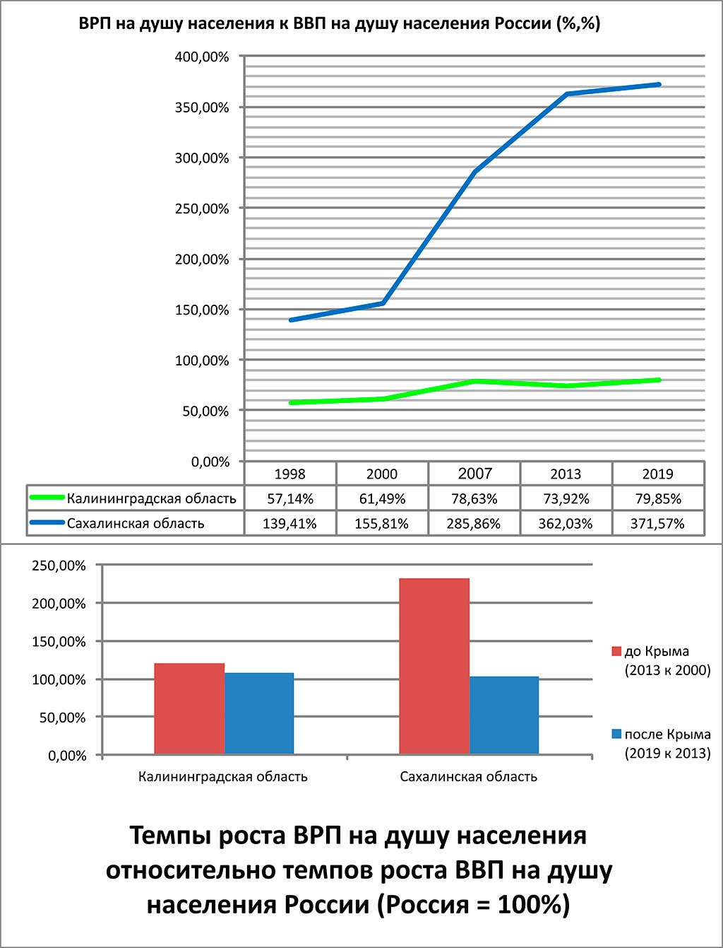 С точки зрения экономики базовые показатели валового регионального продукта (ВРП) на душу населения, как и сама структура экономики, в рассматриваемых регионах очень разные. Так в Калининградской области ВРП на 20% уступает подушевому ВВП России, но большую часть времени он рос быстрее общероссийского на 10−20%. В Сахалинской области, одном из важнейших нефтедобывающих регионов страны, все постсоветское время ВРП на душу населения был выше соответствующего показателя для всей страны. Но если на рубеже веков основной валовый подушевой показатель экономики Сахалина превышал российский ВВП на душу населения в полтора раза, то к 2019 году уже в 3,5 раза.