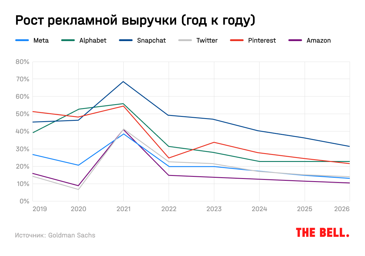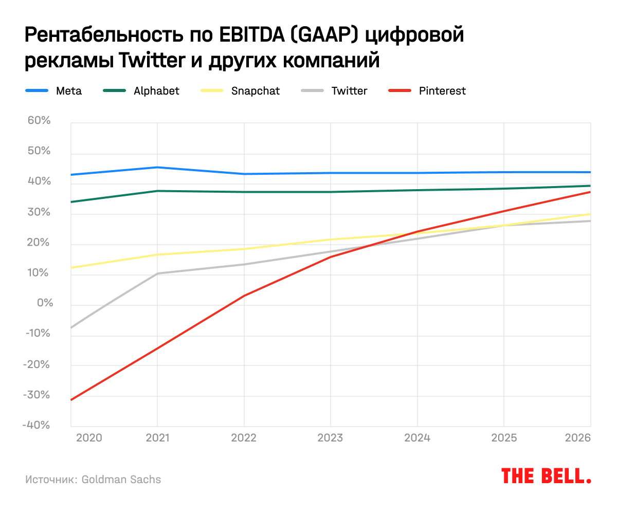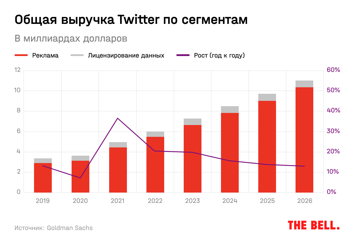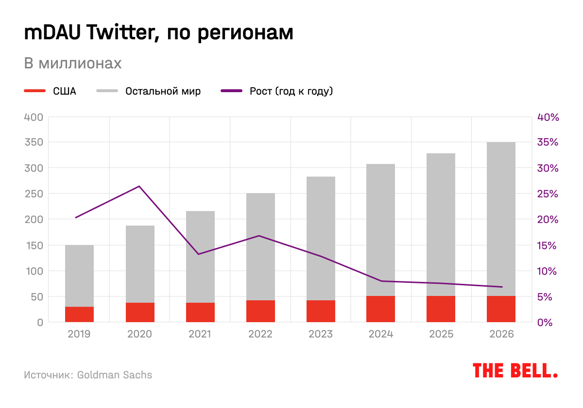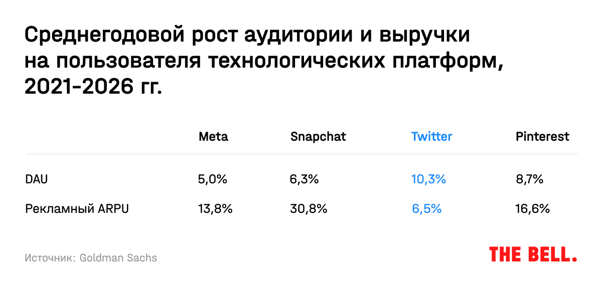 Несмотря на уникальное положение онлайнового аналога «городской площади», выручка Twitter, по прогнозу GS, будет расти медленнее рынка — на 17% в год, который будет достигаться за счет роста mDAU на 10,3% в год и выручки на одного пользователя на 6,5% в год.