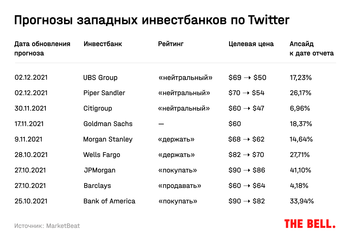 Вуд верит в Twitter: она часто говорит, что ее инвестиционный горизонт — 5 лет, что отражает тот факт, что акции технологических компаний могут быть волатильны. Оптимистично смотрит на перспективы соцсети и JPMorgan: инвестбанк включил Twitter в список топ-6 наиболее перспективных компаний IT-сектора в 2022 году с целевой ценой в $86, что предполагает апсайд в 91%.