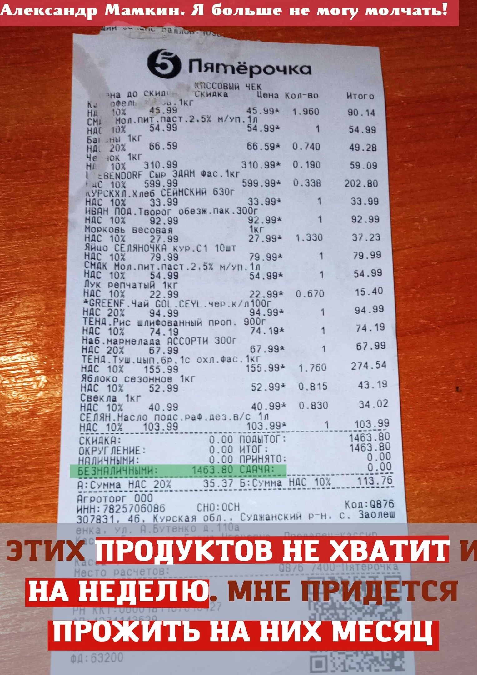 У него самого огород есть. Мамкин живет в частном доме, держит двух коз и на уровне "натурального первобытного хозяйства" вполне себя обеспечивает. "Овощи, картофель, фрукты, соя, огурцы-помидоры закатанные. Часть приходится покупать. Я каждый месяц стараюсь употреблять 300–400 грамм орехов и сухофруктов, потому что они высококалорийные и позволяют сохранить работоспособность. В магазине покупаю, как правило, продукты по акции, то есть у которых заканчивается срок годности, которые, может быть, не очень качественные, к сожалению, хлеб пеку дома сам", – рассказал он корреспонденту Север.Реалии.