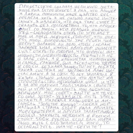 Девушка Юрия Хованского опубликовала очередное письмо блогера из СИЗО. Там он назвал Россию «царством беспредела» и заявил, что рад отъезду Моргенштерна и других исполнителей из страны. По его словам, за границей будут рады принять таких «талантливых людей».