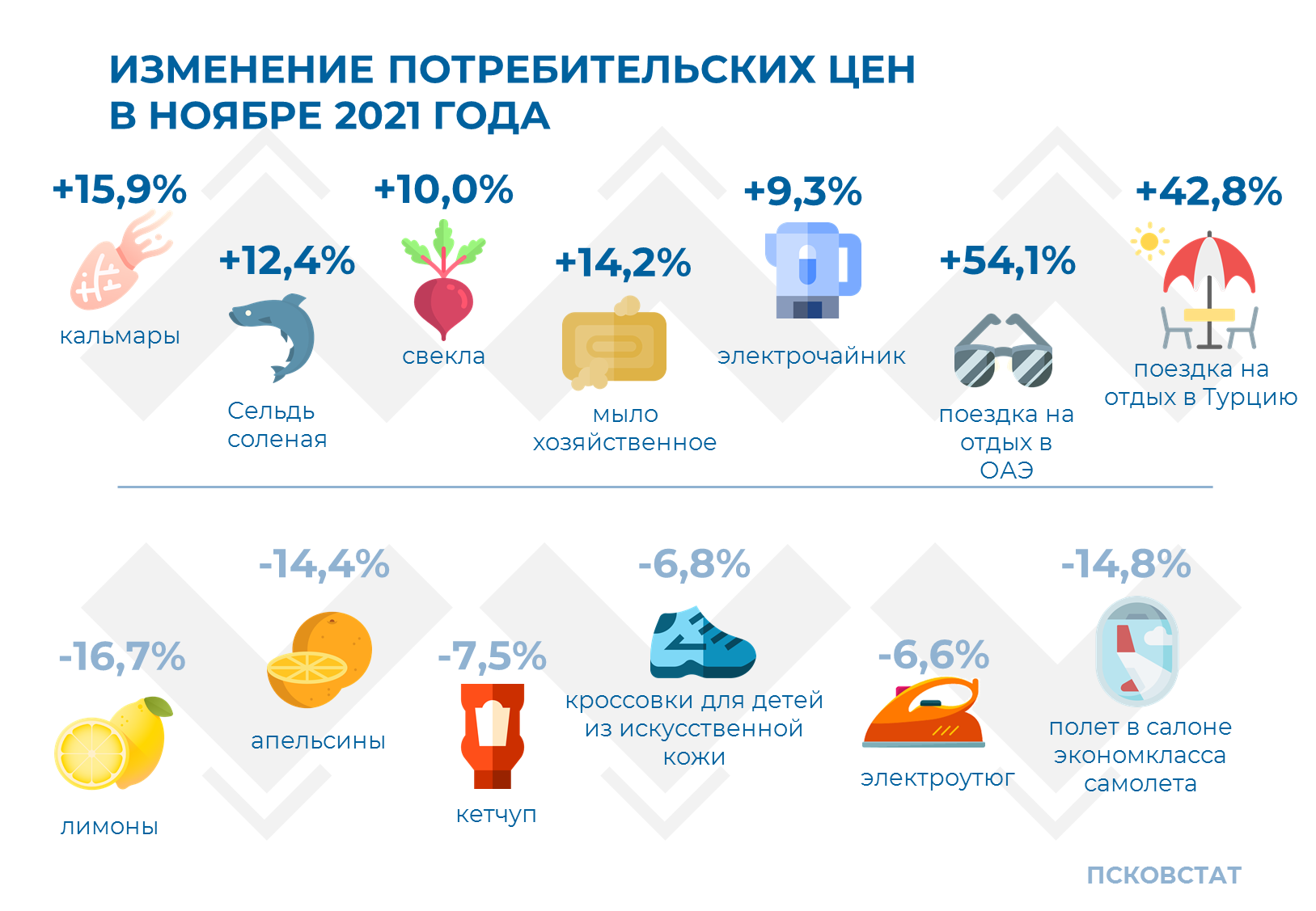 За год, с ноября 2020 года по ноябрь 2021 года, потребительские цены в Псковской области выросли более чем на 8 процентов: по данным Псковстата, за ноябрь по сравнению с октябрём 2021 года цены выросли на 0,7 процента, по сравнению с декабрём 2020 года – на 7,3 процента.