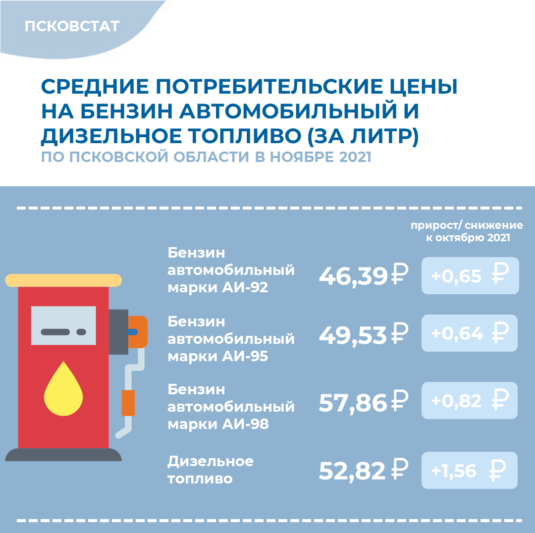 | | | | --- | --- | | | Ноябрь 2021 в % к | | октябрю 2021 | декабрю 2020 | ноябрю 2020 | | Бензин автомобильный марки АИ-92 | 101,42 | 107,56 | 107,56 | | Бензин автомобильный марки АИ-95 | 101,30 | 107,10 | 107,11 | | Бензин автомобильный марки АИ-98 | 101,44 | 108,51 | 108,53 | | Дизельное топливо | 105,60 | 114,66 | 115,10 |