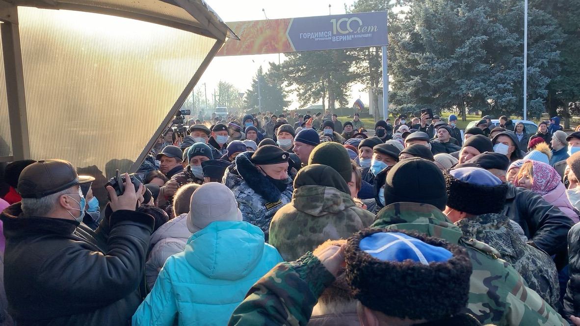 Ближе к семи вечера начинает падать снег, в станице темно. На площади стоят казаки, периодически к ним подъезжает поболтать кто-то из тех, кто тоже ждет завтрашнего собрания. Ведутся разговоры про простой народ, землю, беспредел. Казаки обещают отвезти к атаману, корреспонденту «Медиазоны» указывают на машину, где есть водитель по имени Сергей и две женщины.