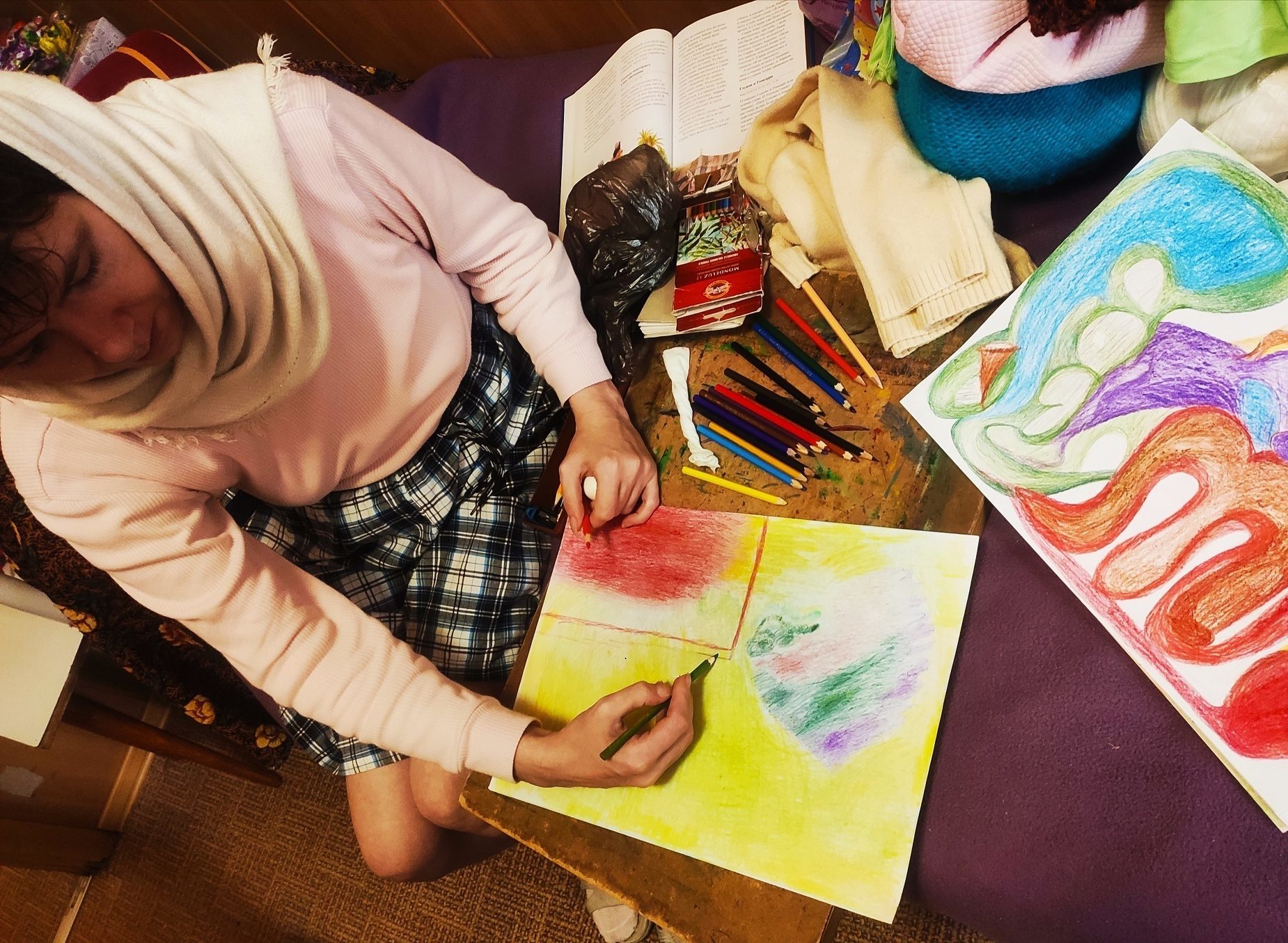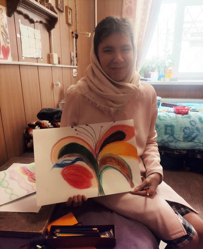 Я встречаю Алену сидящей на своей кровати в общей комнате для женщин «Покровской общины». Ворот свитера почти на уровне рта, шерстяной платок на голове, и только глаза смотрят пронзительно и немного устало, так, будто читают мысли. Она что-то рисует, яркие краски разлиты по бумаге — синий, красный, желтый, фиолетовый.