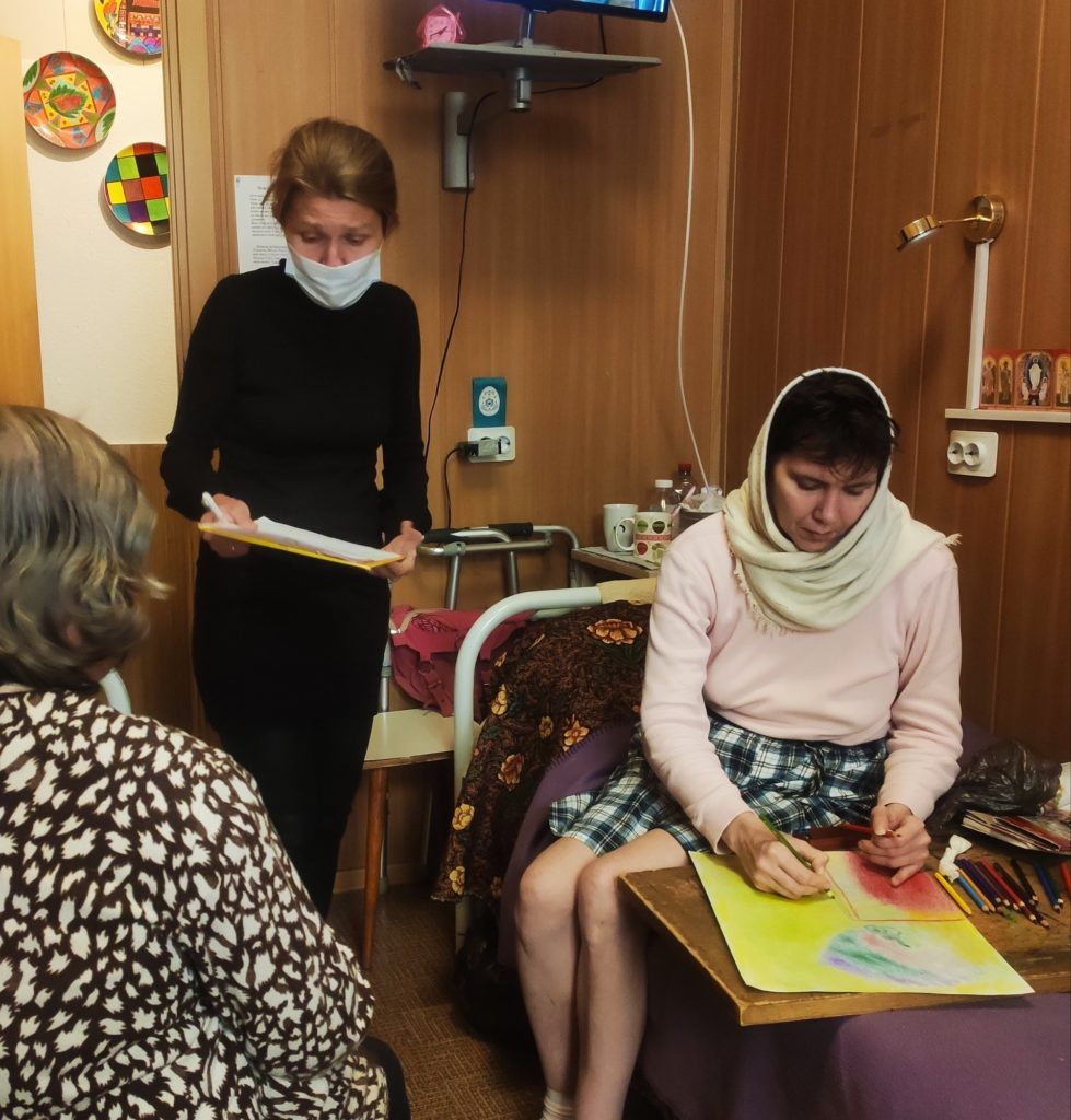 Алена на занятии арт-терапиейФото: Ольга Конышева В феврале одичавшую Алену обнаружил арендодатель и, вместо того чтобы выгнать на улицу, стал искать контакты благотворительных организаций. Так «Социальный патруль» привез ее в приют «Покровской общины».