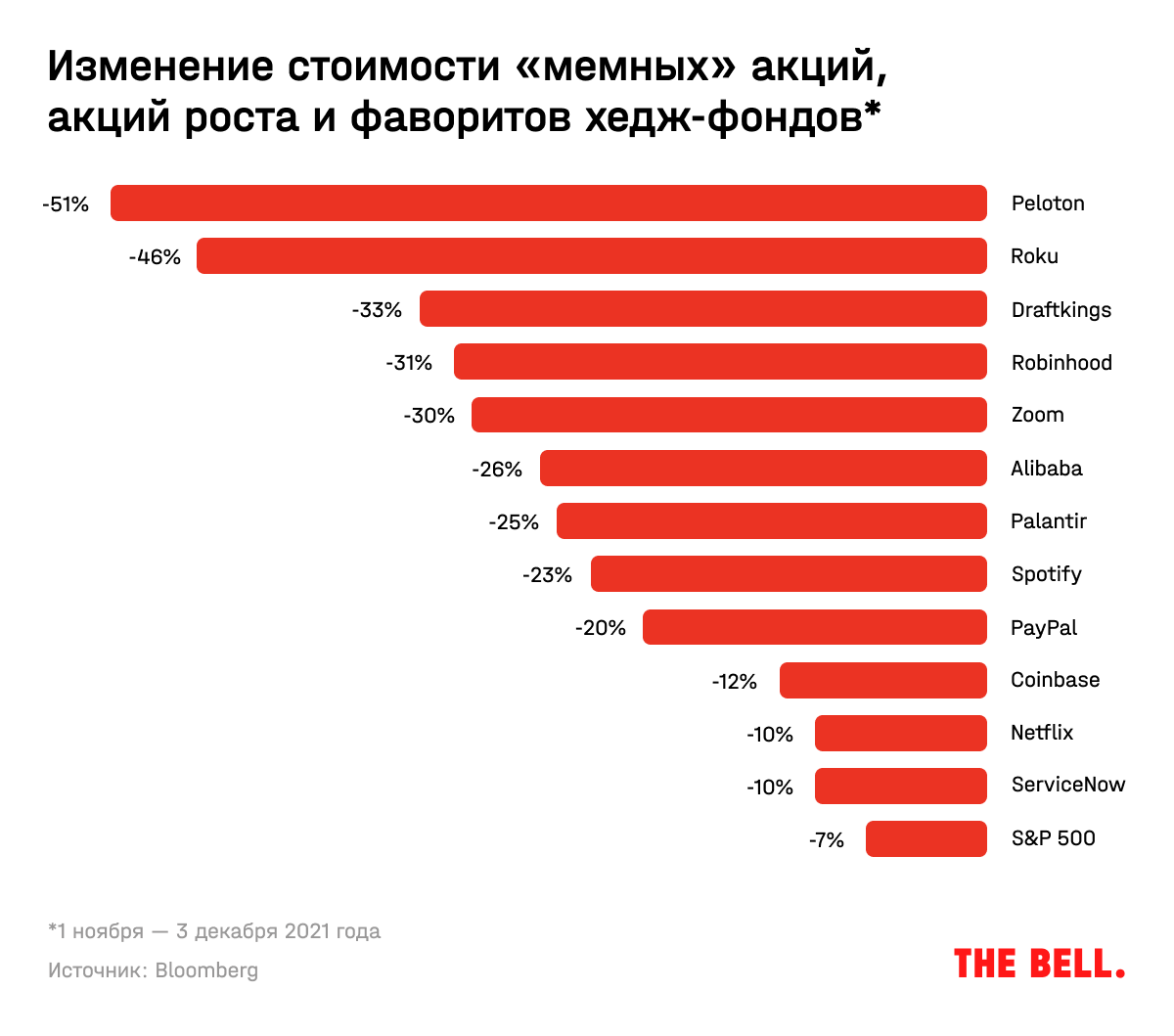 Вероятно, они могут появляться в случае падения цены отдельных акций. Один из аналитиков, которых цитирует Bloomberg, сравнивает текущую ситуацию на рынках с фильмом Квентина Тарантино, где главные события, пока идет вечеринка, происходят на втором плане. Пока индексы вытягивают бигтехи, многие акции роста, «мемные» бумаги и другие любимцы частных инвесторов сильно падают.