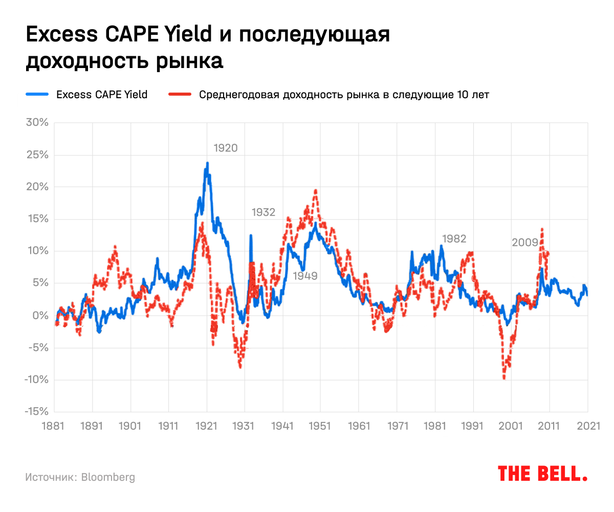 Чем меньше значение Excess CAPE Yield (ECY), тем больше акции переоценены по сравнению с облигациями, что может свидетельствовать о том, что рынок перегрет. Как показывают расчеты Bloomberg, индикатор ECY так же точно предсказывал доходность рынков в следующие 10 лет, по крайней мере в XX веке.