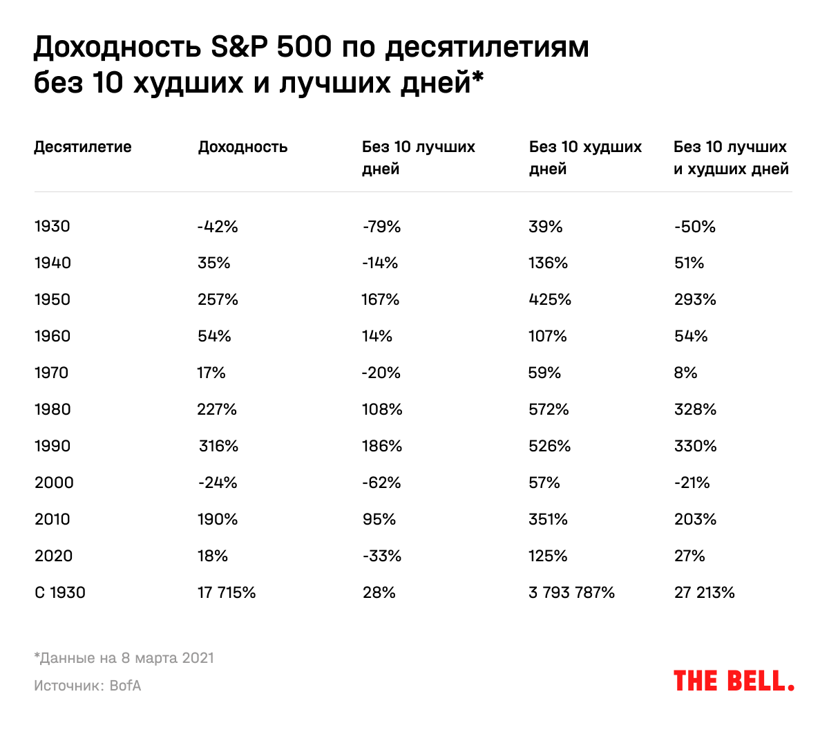 В результате выжидание идеального момента для инвестиций может привести к упущенной выгоде. Bank of America подсчитал, что доходность S&P 500 с 1930 года превысила 17 тысяч процентов. Но если исключить из этого периода 10 лучших дней в каждом десятилетии, она составит всего 28%. А если пропустить наихудшие 10 дней, которые обычно предшествуют наилучшим, доходность взлетит до космических 4 млн процентов. Но шансов угадать лучшие и худшие дни — немного: вероятность, что в отдельно взятый день рынок снизится — 46%, то есть почти половина.