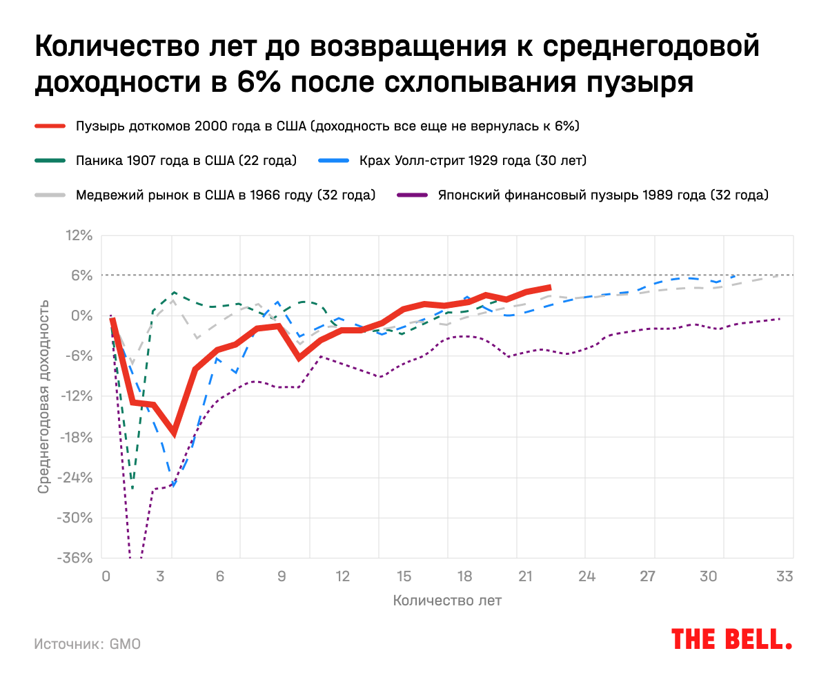 Схлопывание пузырей на рынках может значительно снизить доходность даже долгосрочных инвестиций: если бы вы вложились в индекс S&P 500 на пике пузыря доткомов в 2000 году, то к осени 2021-го рост вашего портфеля не превышал 6% годовых (с учетом инфляции) — даже несмотря на выдающийся рост на рынке акций в последние 10 лет, когда S&P 500 в среднем прибавлял по 16,6% в год, подсчитали в инвесткомпании GMO.