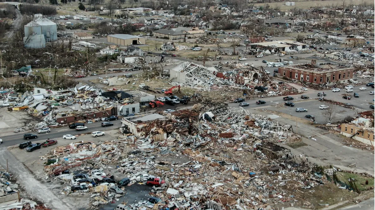 Разрушительный воздушный столб, прошедший через Кентукки, мог преодолеть расстояние в 400 км, что станет рекордом за всю историю наблюдений за природными катастрофами. Телевидение и соцсети заполнены кадрами разрушений в городе Мэйфилд: там, где стояли дома, груды кирпича, сквозь разорванные ураганом крыши видна разбитая мебель, а велосипеды и холодильники свисают с деревьев, как елочные украшения. Ворвавшись в город, смерч срывал дома с фундаментов.