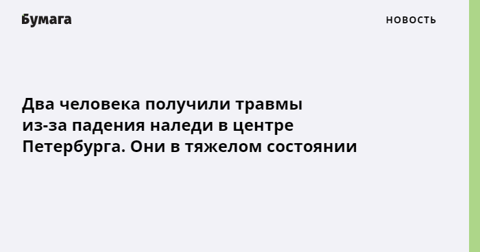 Два человека пострадали в Петербурге из-за падения наледи, сообщили «Бумаге» в городской прокуратуре. Ведомство проводит проверки в Адмиралтейском и Центральном районах.