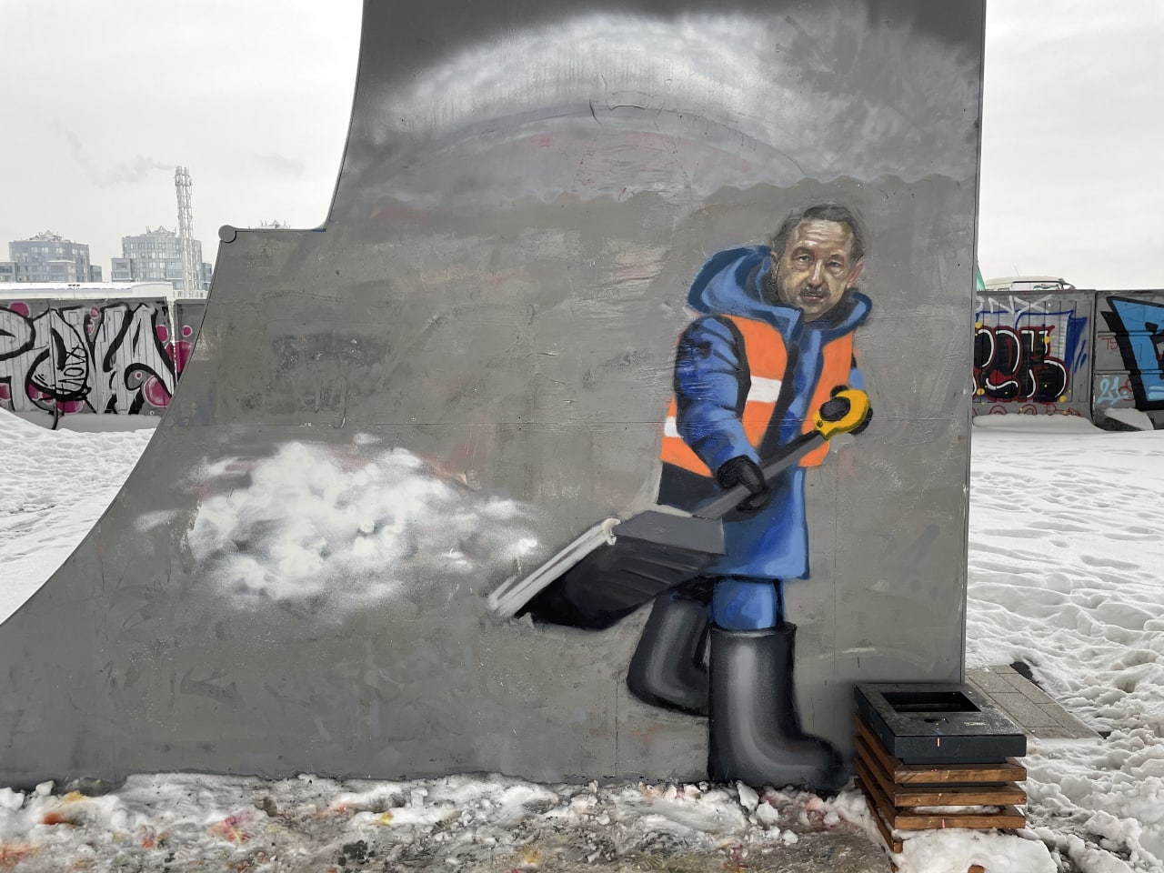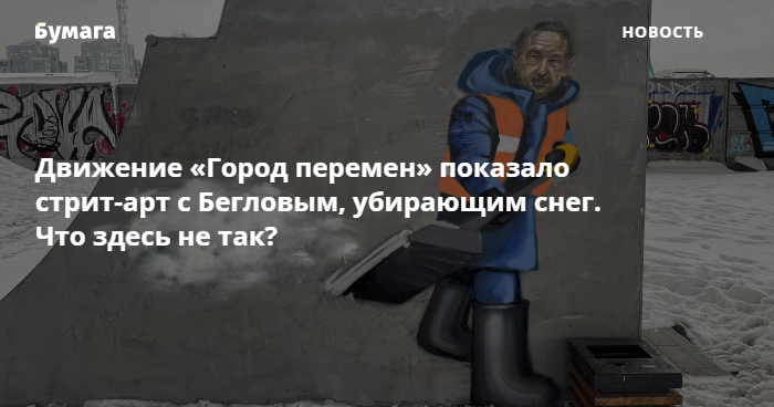 Участники движения «Город перемен» сообщили, что под мостом Бетанкура в Петербурге появился стрит-арт с Александром Бегловым, убирающим снег. Активисты опубликовали фотографии и видео.