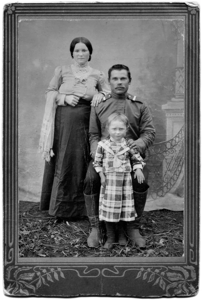 Д. Е. Жунтова-Черняева с мужем Василием Филипповичем Черняевым и дочерью Грушей. Муж в военной форме перед уходом на фронт. Лепсинск (Семиречье). 1914 г. Фото: «Русский мiръ»