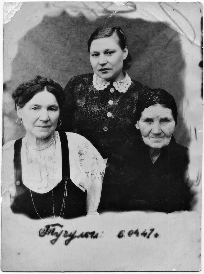 Д. Е. Сидорова (слева) с приёмной дочерью (de facto), сиротой Александрой Красильниковой и Евдокией Чусовитиновой, тёткой А. Н. Сидорова. С.Тугулым, Свердловская обл. 1947 г. Фото: «Русский мiръ»