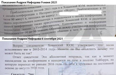 До этого блогер Дмитрий Ларин, которого также вызывали на допрос по делу Хованского, обвинил Андрея Нифедова в даче ложных показаний. «Почему Андрей Нифедов сказал, что стрим проходил в 2018 году? Это очень важный момент, так как 2018 или 2012 год — большой промежуток времени, который влияет на приговор и ведение дела. <…> Это ложь», — заявил он.