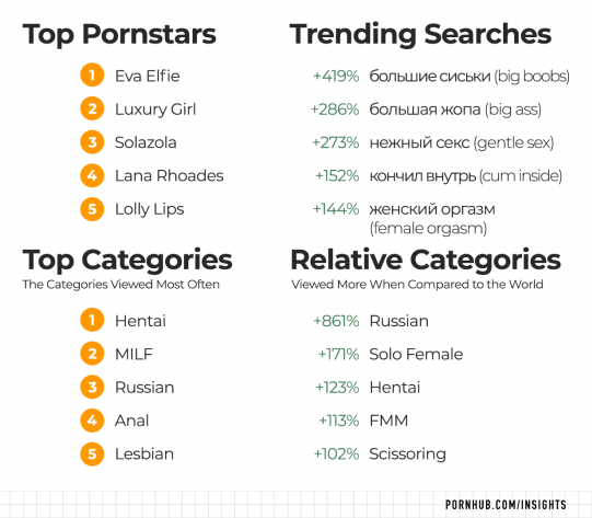 В 2021 году россияне чаще всего искали на Pornhub ролики из категорий «русское» порно, хентай и MILF. Далее следуют лесбийское порно, «русское домашнее» и POV.