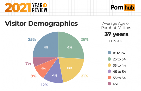 По данным Pornhub, в его российской аудитории больше всего (34 %) пользователей от 18 до 24 лет. Люди от 25 до 34 лет составляют четверть от всей аудитории сайта. Далее идут возрастные категории от 35 до 44 (17 %), от 45 до 54 (10 %) и от 55 до 64 (8 %). Россиян старше 65 лет на сайте всего 6 %.