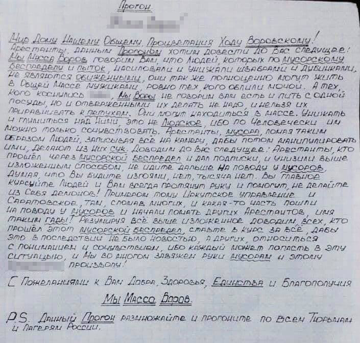 В сообщении, подписанном «массой воров», содержится неожиданно гуманистический для этой крайне консервативной среды посыл: тот, кто был «по мусорскому беспределу» изнасилован шваброй или дубинкой, либо же облит мочой, не должен получать статуса «обиженного».